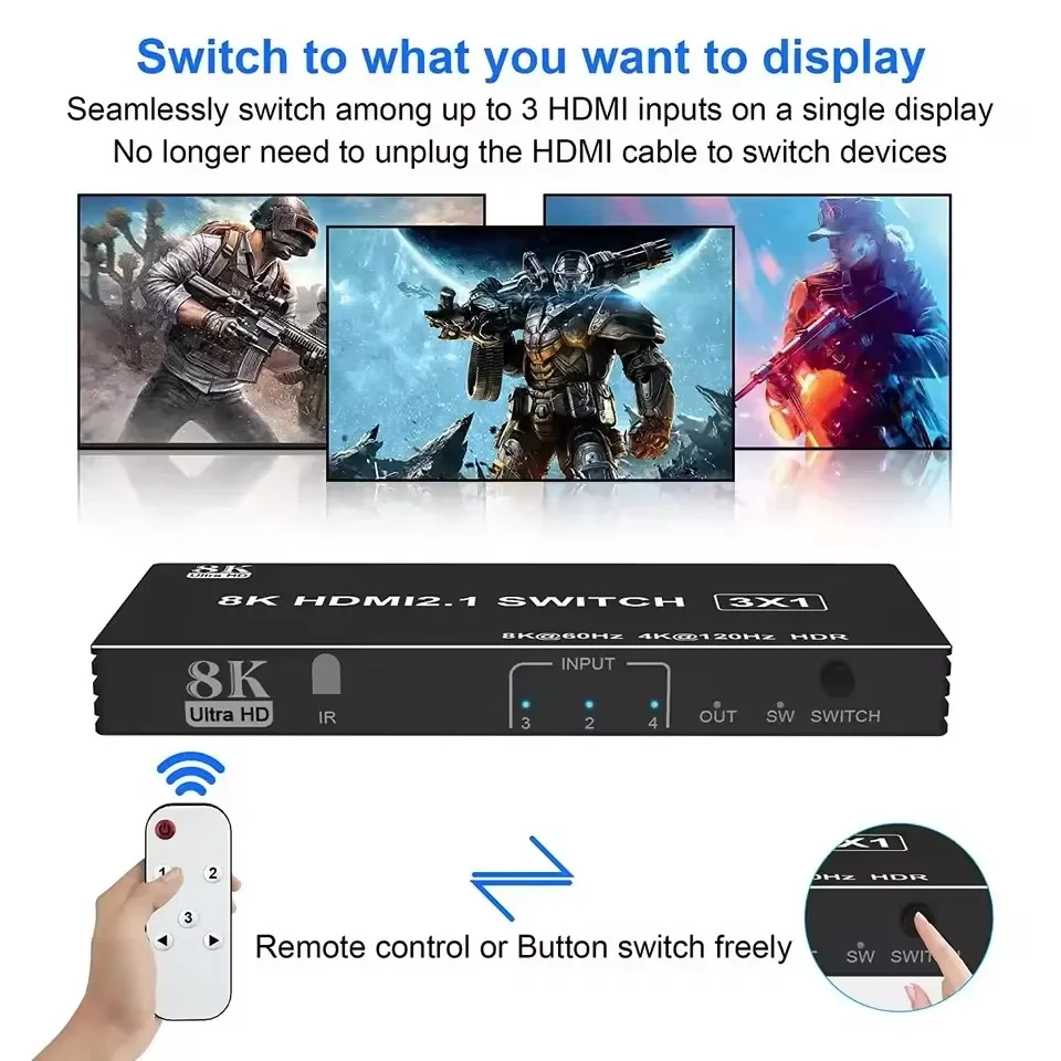 This HDMI Switcher with IR remote control supports 8K@60Hz,4K@120Hz,2K@144Hz, IR Control, HDR,