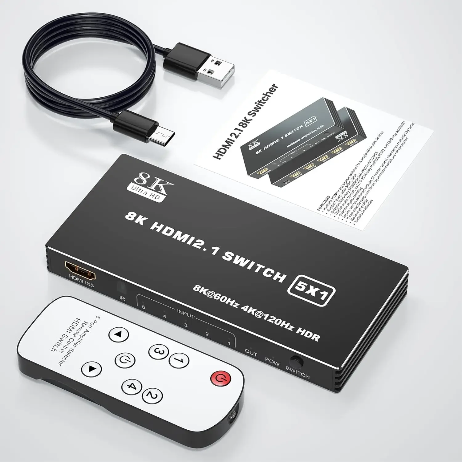 This 8K@60Hz / 4K@120Hz HDMI Switcher 5 Inputs 1 Output with IR remote control support for the latest in High-bandwidth Digital Content Protection and HDMI specification guarantees system compatibility and stability.