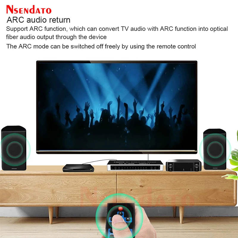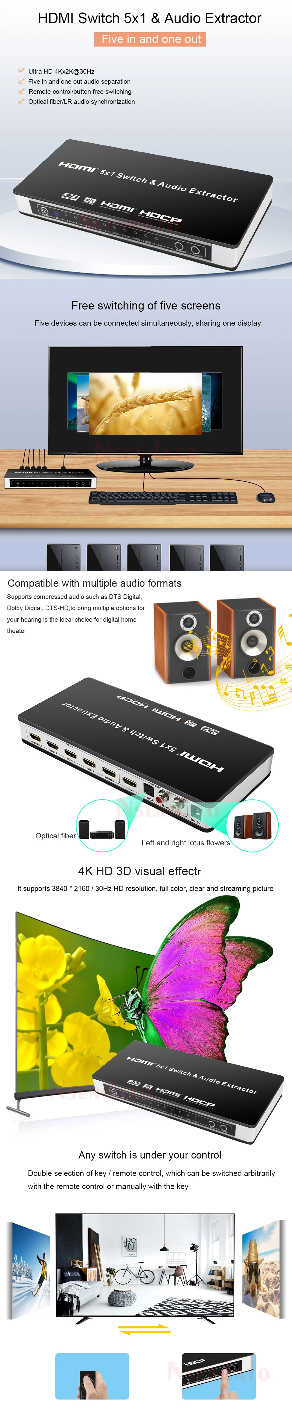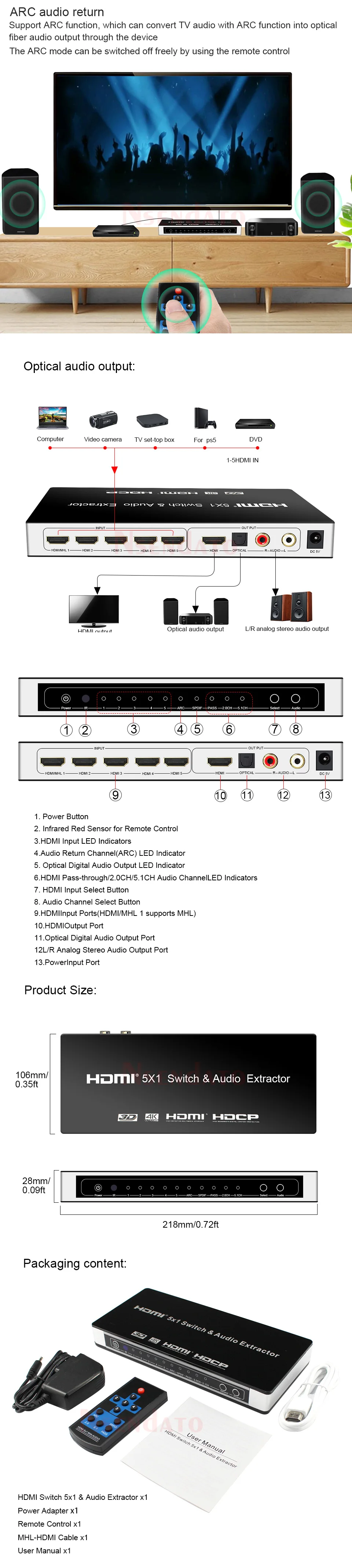 Conmutador HDMI 5X1 con extractor de audio Conmutador HDMI 5 en 1 salida 4K con R/L Audio HDMI Switch ARC Extractor de audio con control remoto IR