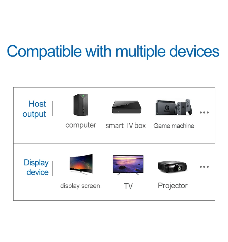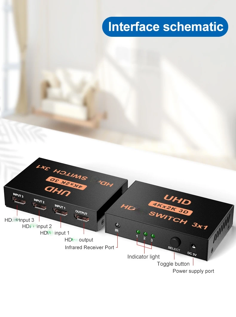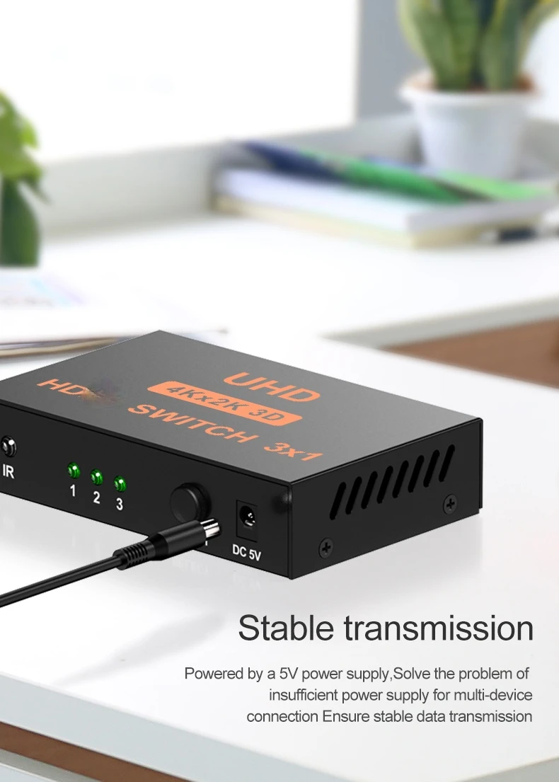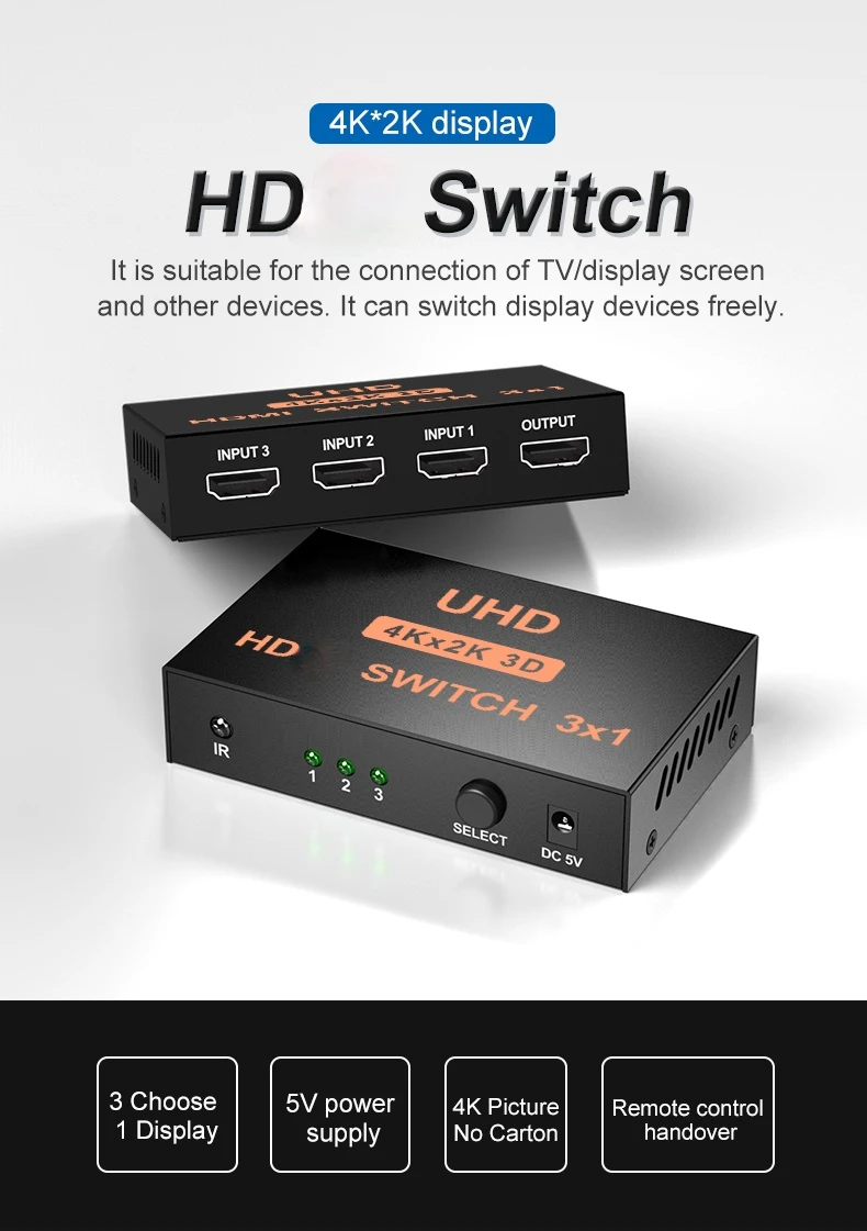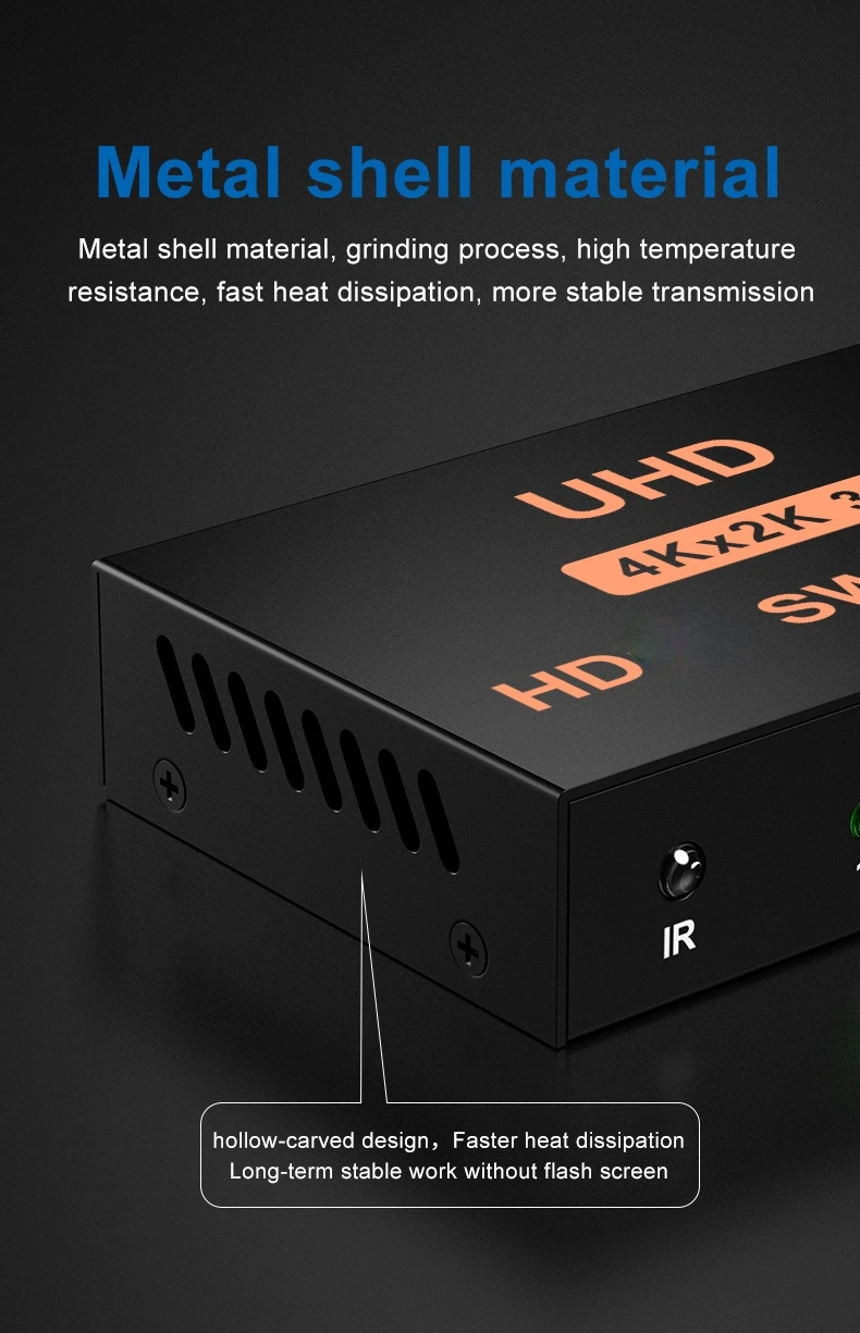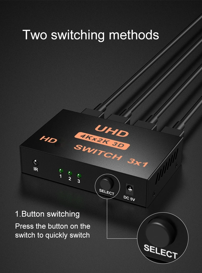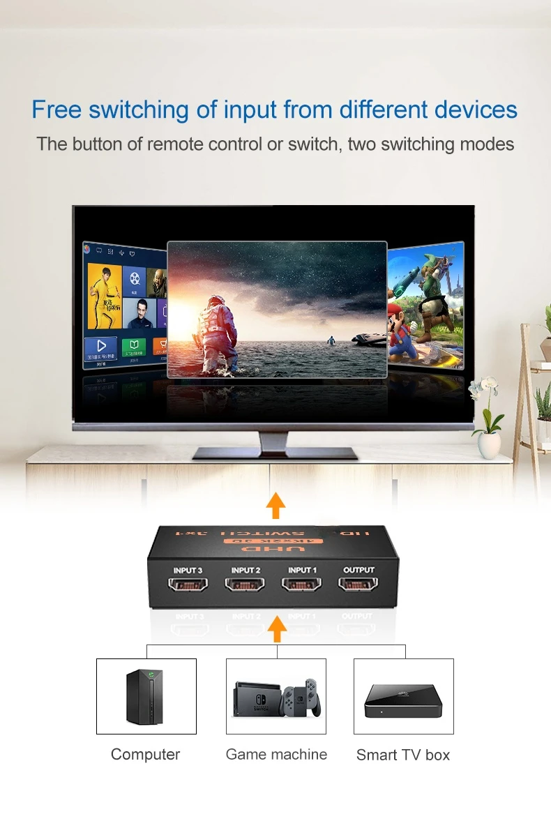 Este conmutador HDMI puede enviar vídeo de alta definición (2160P) y audio digital desde cualquier puerto de origen al monitor. Los puertos de fuente de señal de todos los dispositivos de entrada pueden coincidir con los puertos de vídeo HD al mismo tiempo, y son compatibles con los puertos de vídeo HD de la pantalla 1, 2, 1, PS3, Xbox6, etc. Los puertos de salida del conmutador son capaces de entregar señales de audio/video de alta definición a pantallas de alta definición.