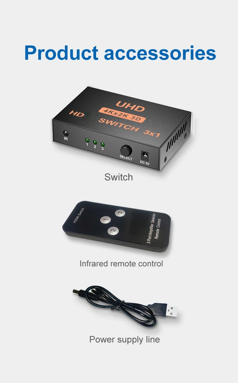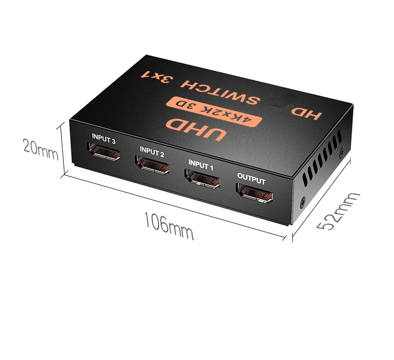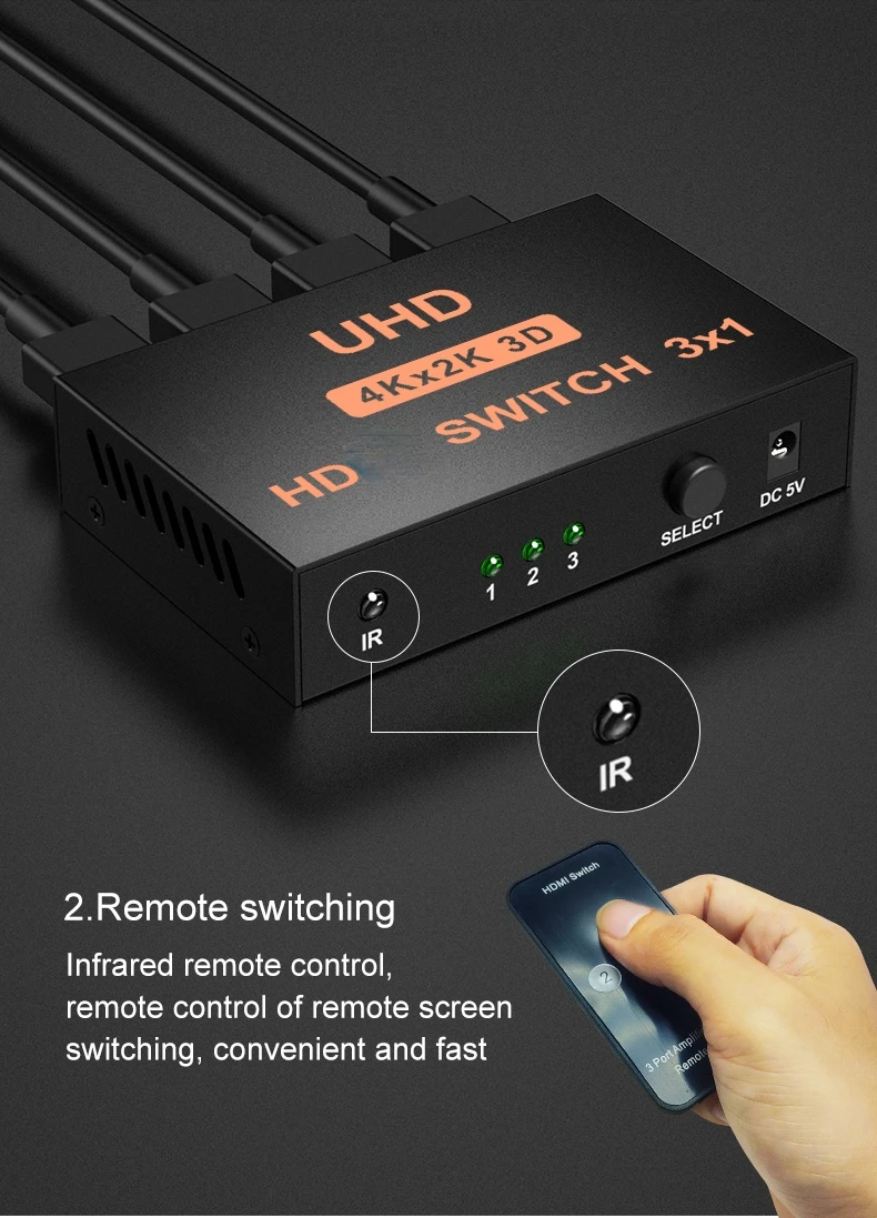 Este conmutador de salida HDMI tres en uno puede cambiar fácilmente tres fuentes de señal a un monitor, y tiene función de conversión de botón y función de conmutación de control remoto.