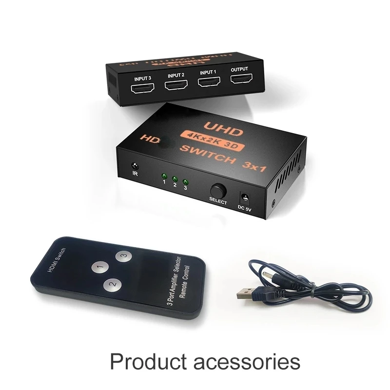 Este conmutador de salida HDMI tres en uno puede cambiar fácilmente tres fuentes de señal a un monitor, y tiene función de conversión de botón y función de conmutación de control remoto.