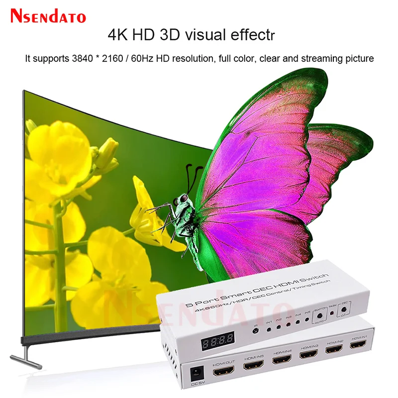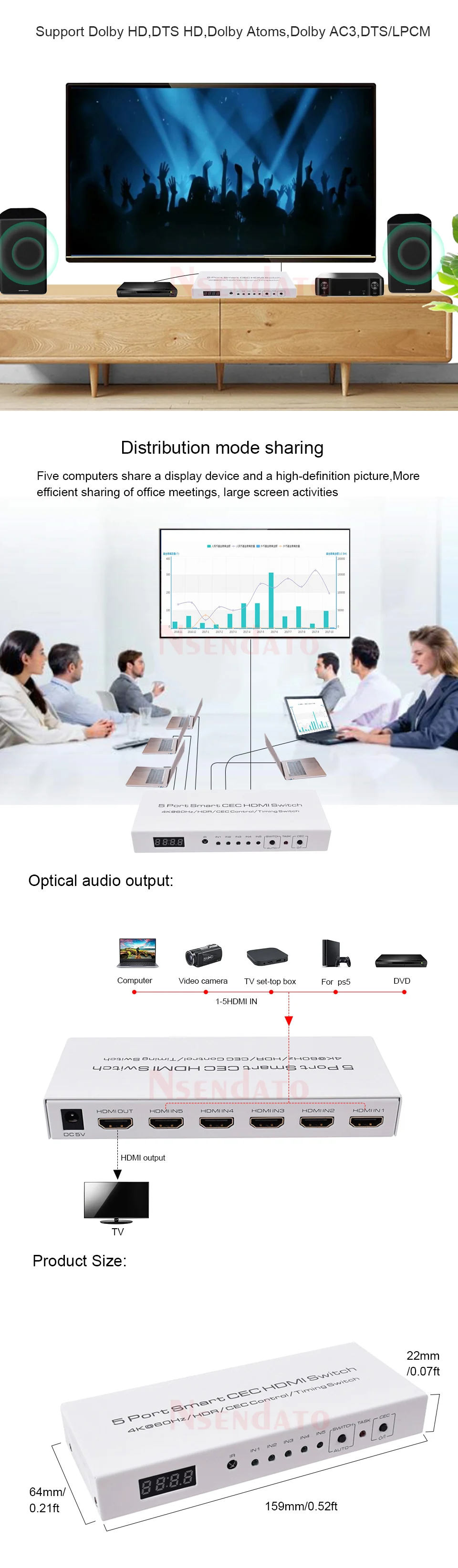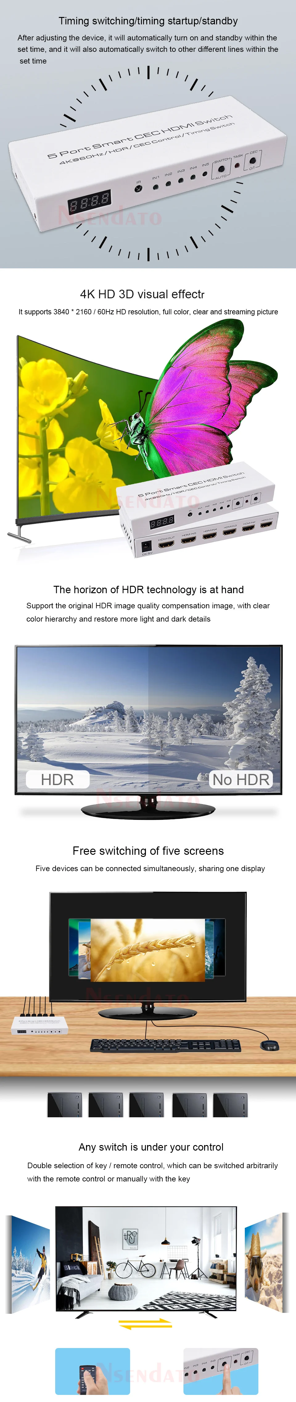 Interruptor de sincronización HDMI CEC inteligente de 5 puertos 4K 60Hz 18 Gbps 5x1 HDR Conmutador adaptador HDMI con IR Romote para Dolby DTS HD LPCM para HDTV PS4