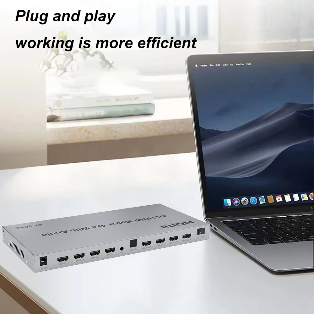 Esta matriz HDMI 4x4 puede conectar 4 fuentes de señal HD a 4 terminales de pantalla HD con fibra óptica y estéreo. salida de auriculares al mismo tiempo a través del puerto de salida HDMI 1.