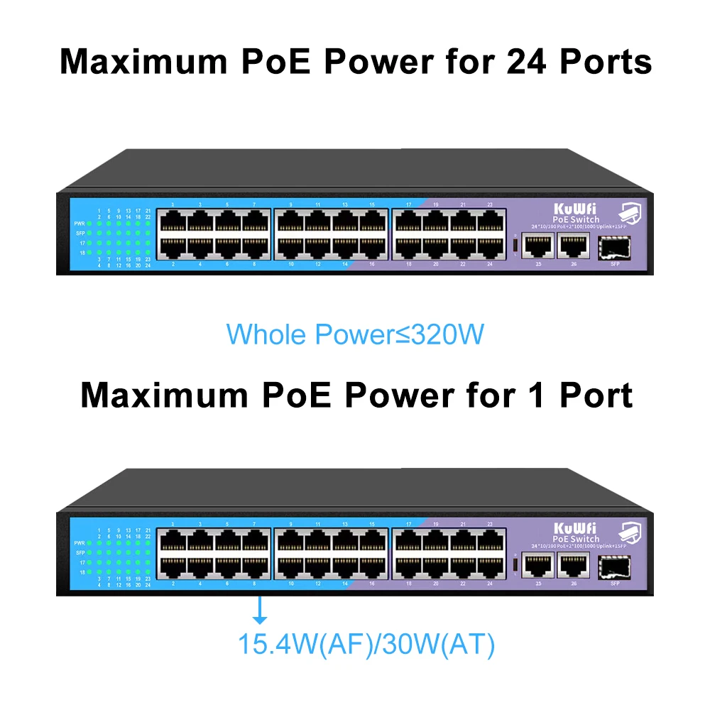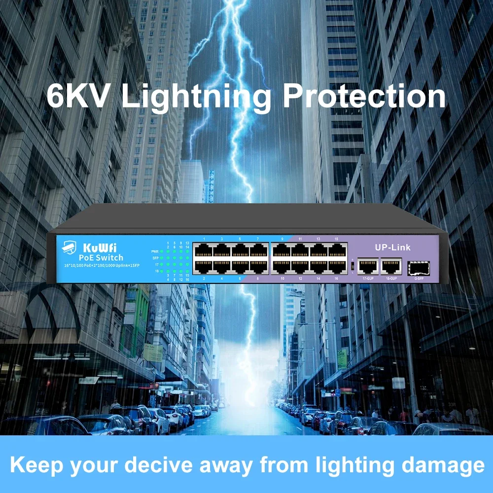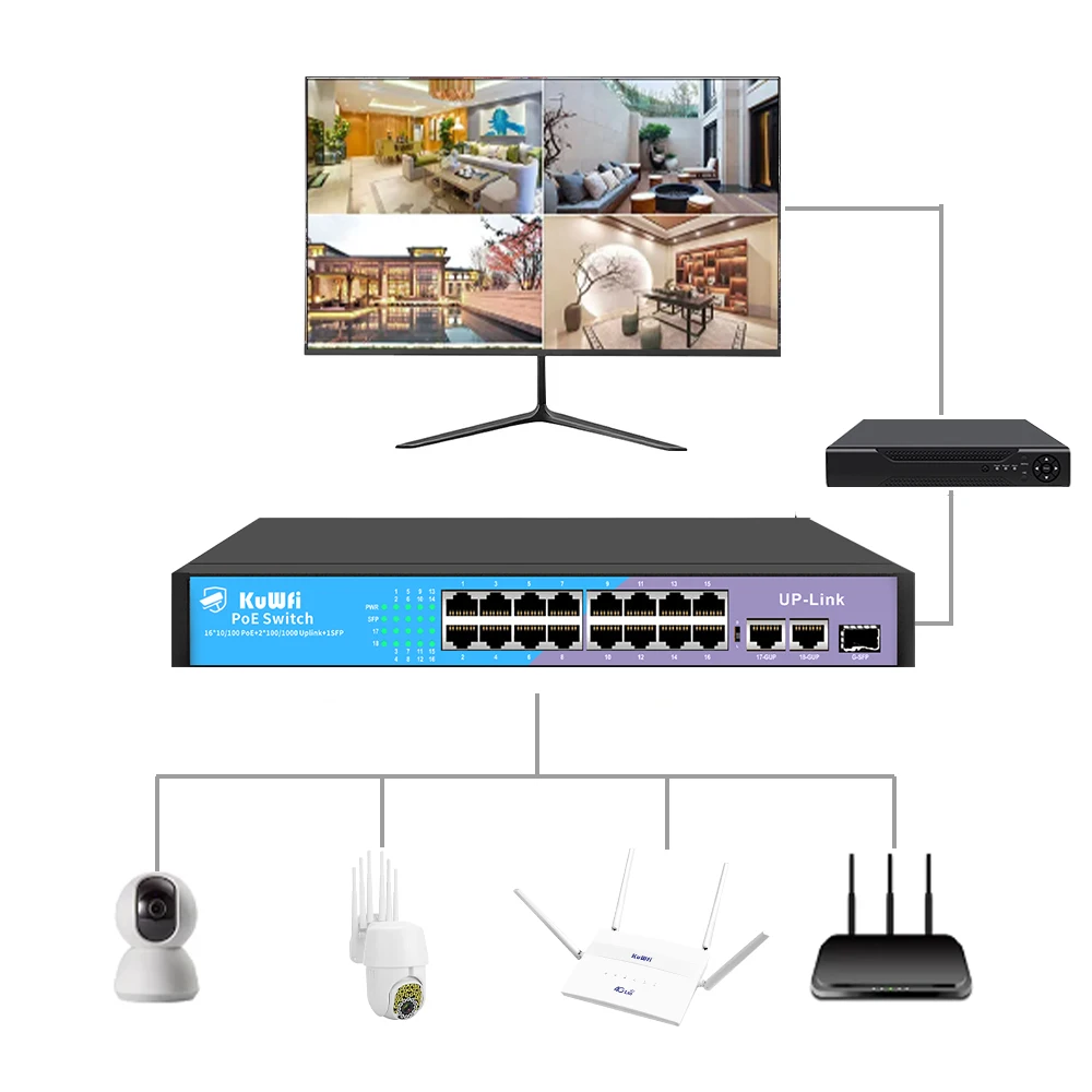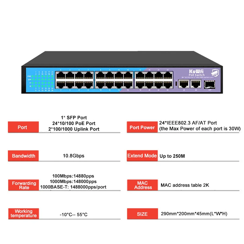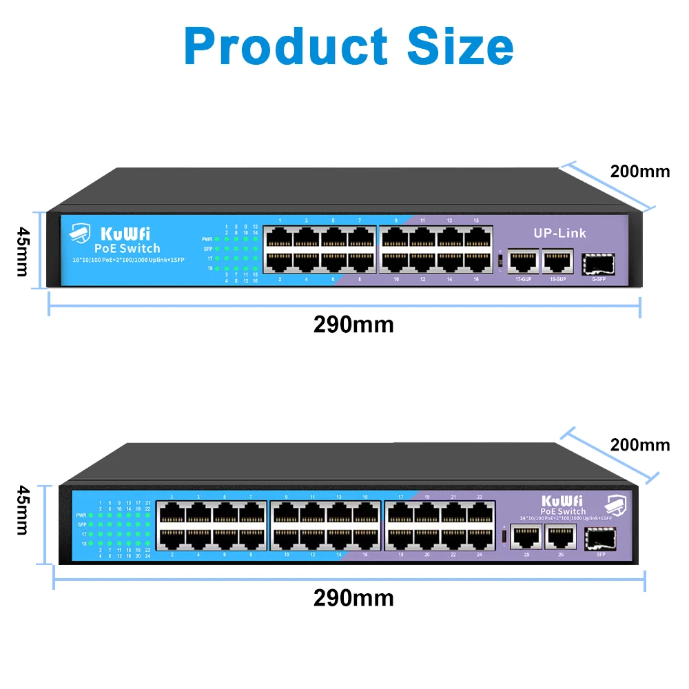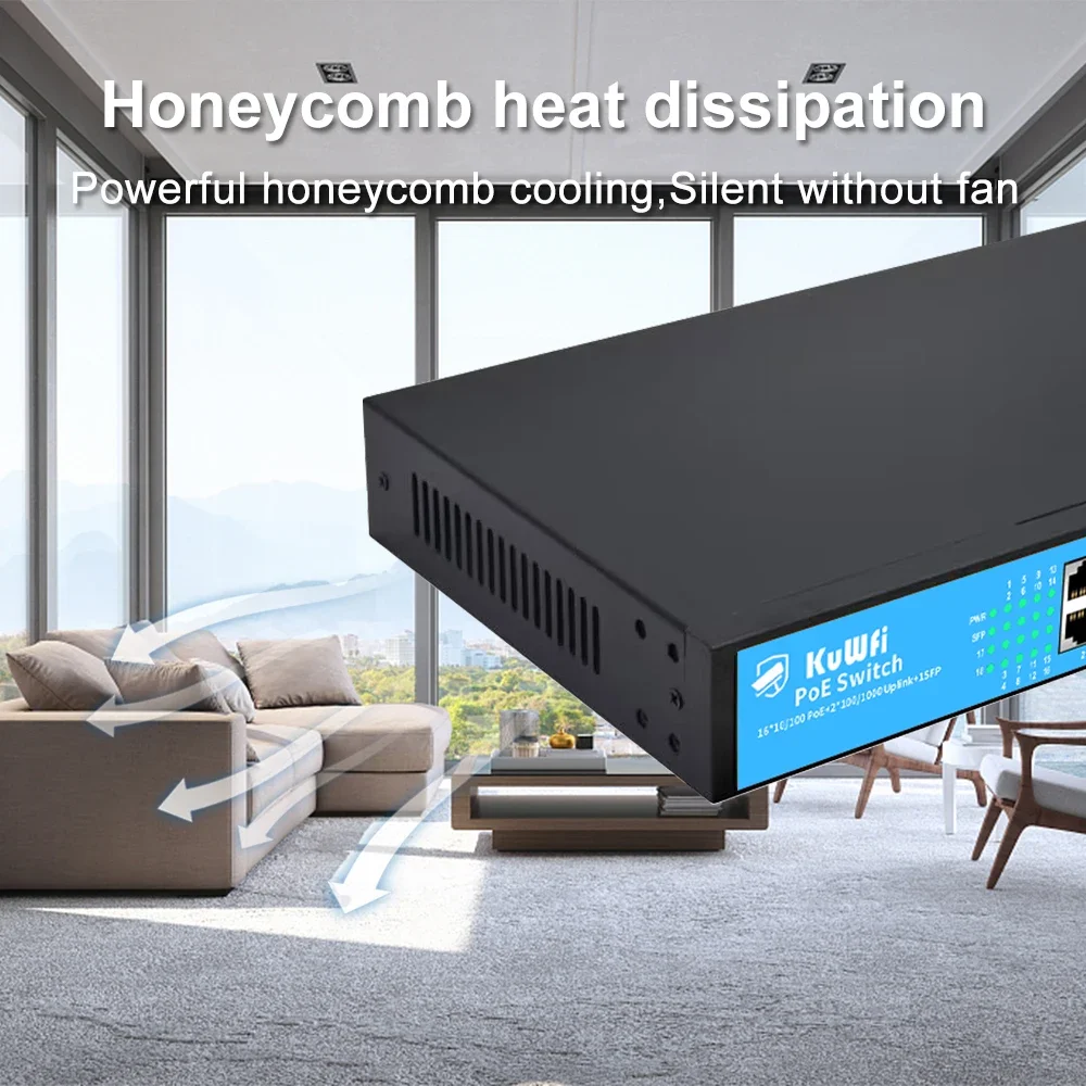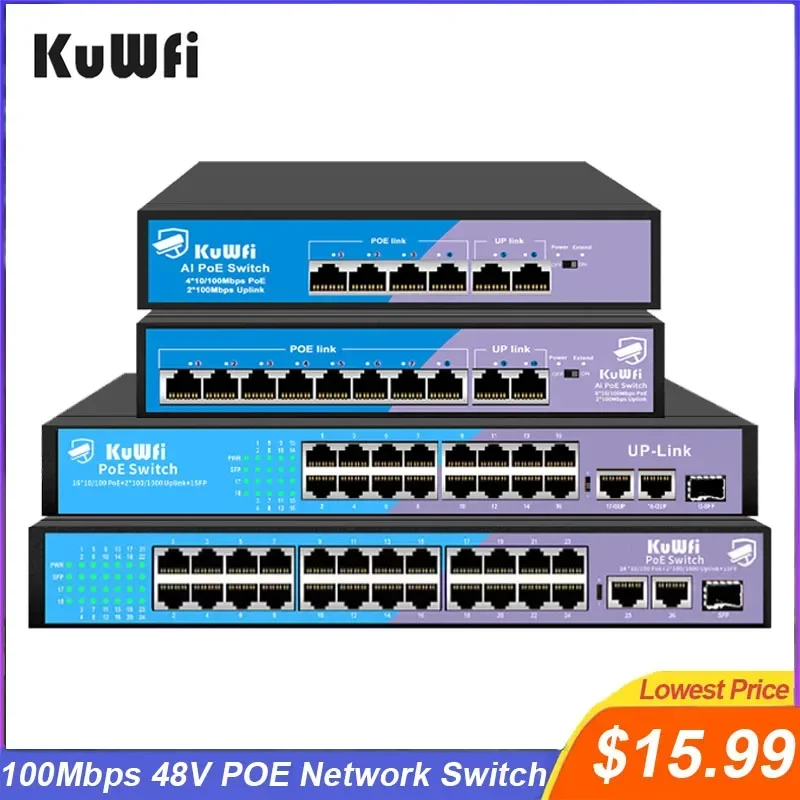 Comprar Conmutador KuWfi 48V POE, 4/8/16/24 puertos, 100Mbps, conmutador Ethernet POE, conmutador de red rápido RJ45 con puerto de enlace ascendente SFP para cámara IP AP