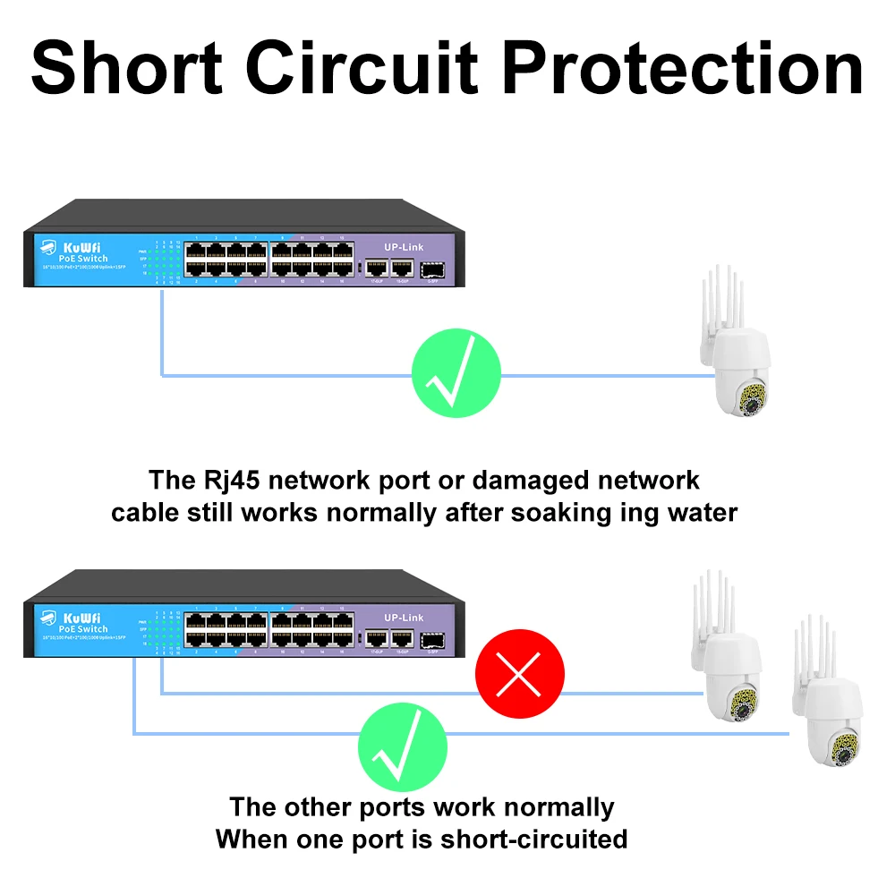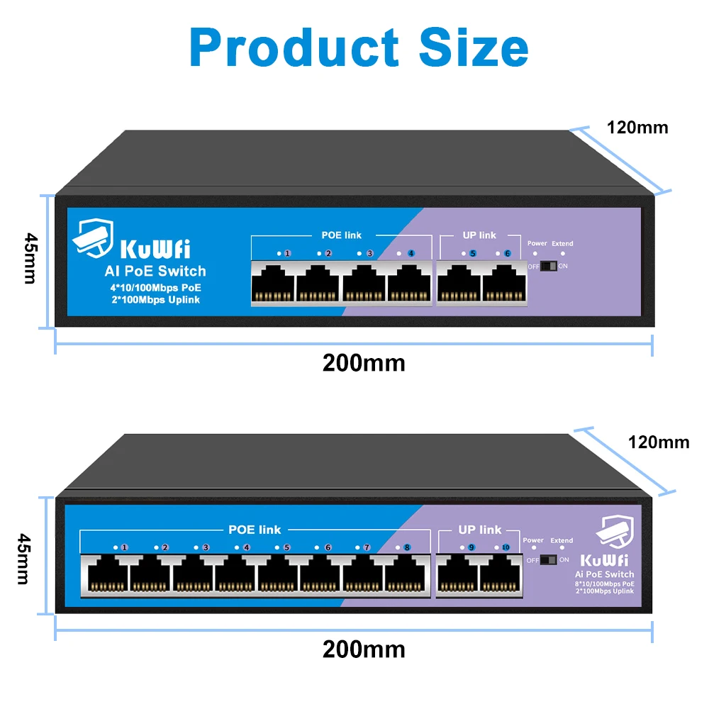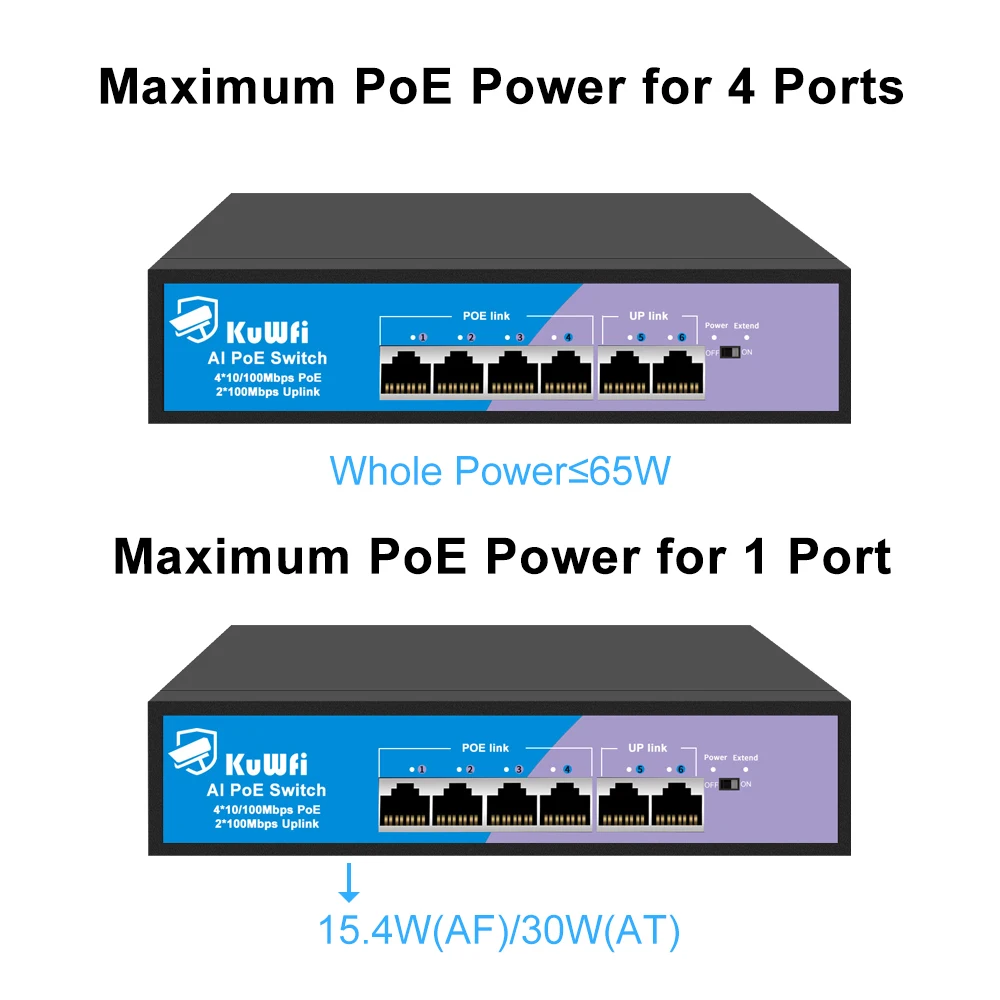 La distancia de transmisión predeterminada de un conmutador poe es de solo 100 metros (100 Mbps), compre activando el modo Utral-Extend, puede lograr una distancia de transmisión de hasta 250 metros (10 Mbps), lo que puede hacer que la distribución de su cámara sea más separada.