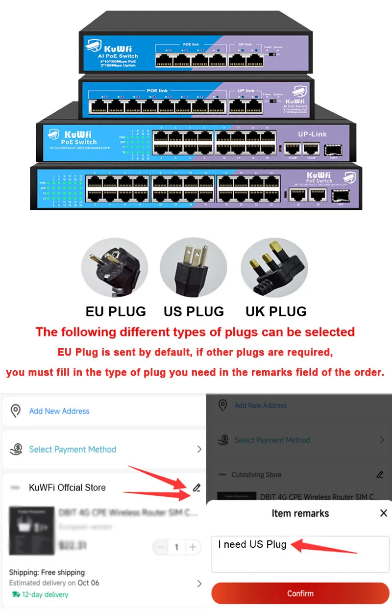 (2) Si necesita reemplazar otros tipos de enchufes, complete el comentario del artículo del pedido al momento de la compra.O póngase en contacto con el servicio de atención al cliente de la tienda antes de realizar una compra.