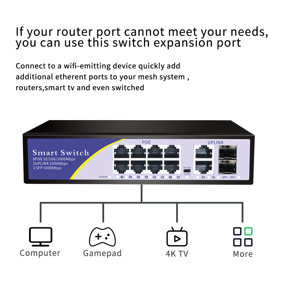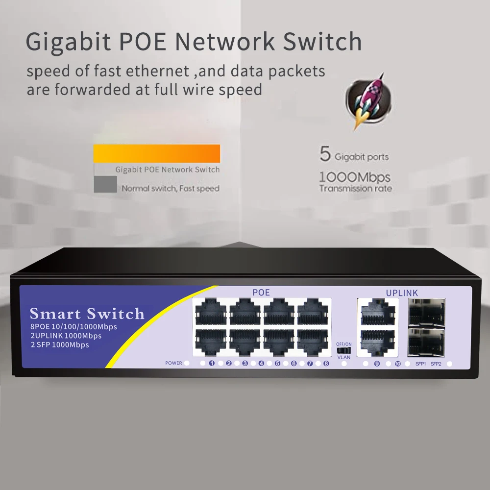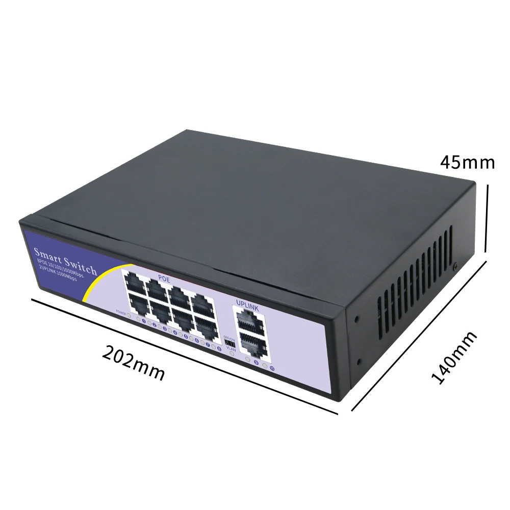 10-Port PoE Switch:8 x 10/100/1000 Mbps PoE ports for Security IP Camera Connection for Router/NVR connection, Plug & Play.