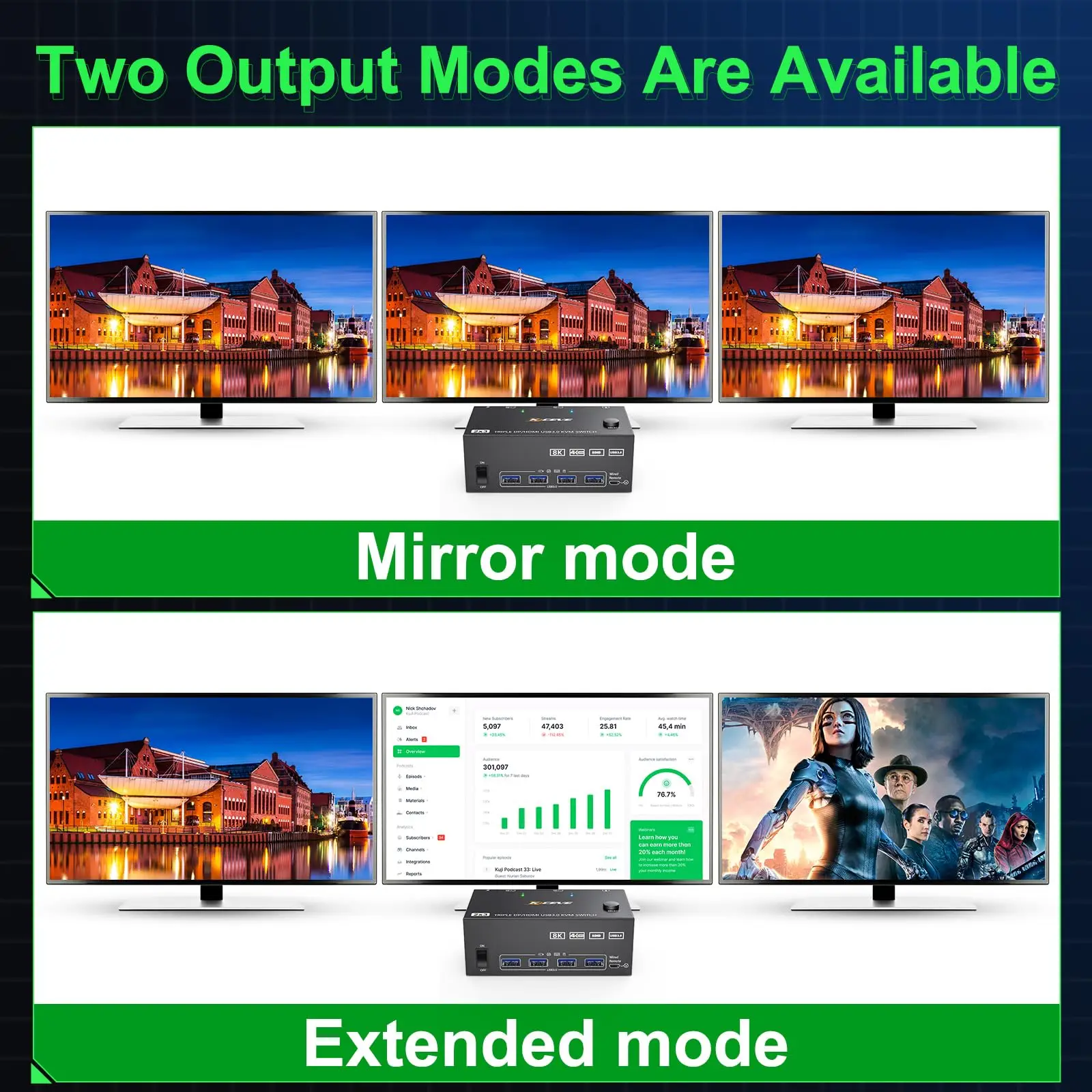 【KVM Switch 3 Monitores 2 Computadoras】Este conmutador KVM de 3 monitores es perfecto para conectar 2 computadoras para compartir 4 puertos USB 3.0 y 3 monitores (admite modos de visualización extendidos y en espejo).Tenga en cuenta que: el modo extendido puede generar tres pantallas diferentes y el modo espejo puede generar tres pantallas idénticas.