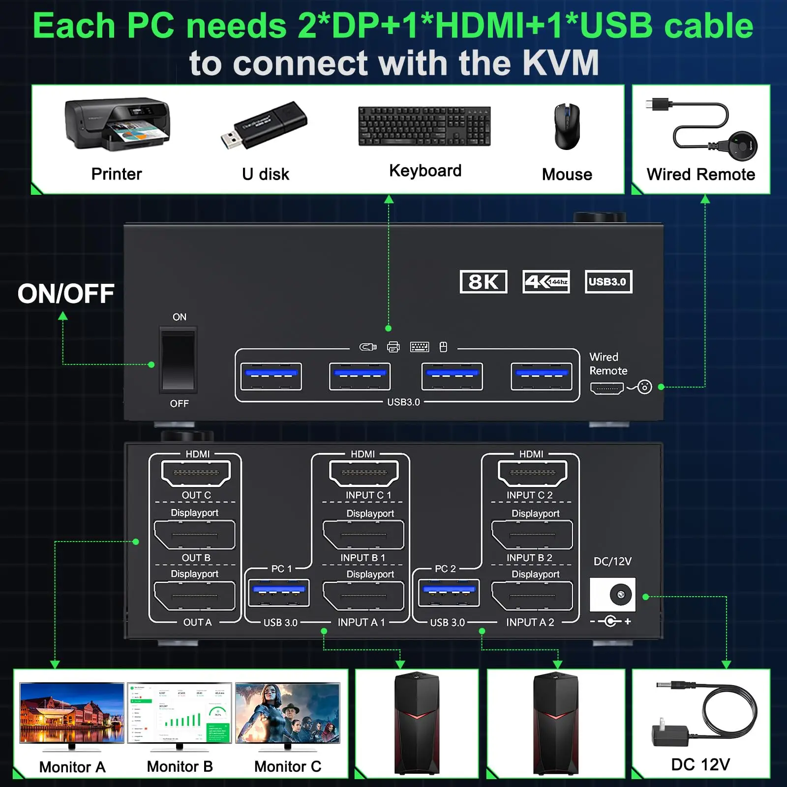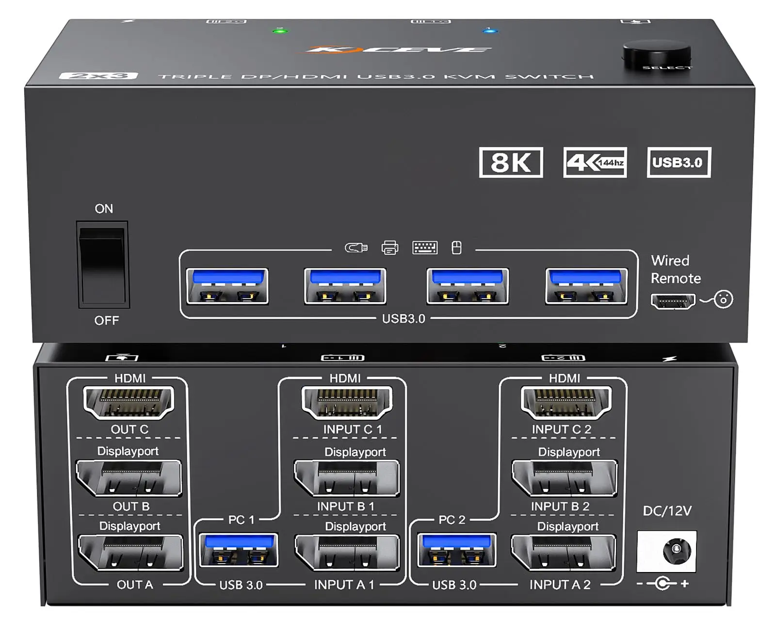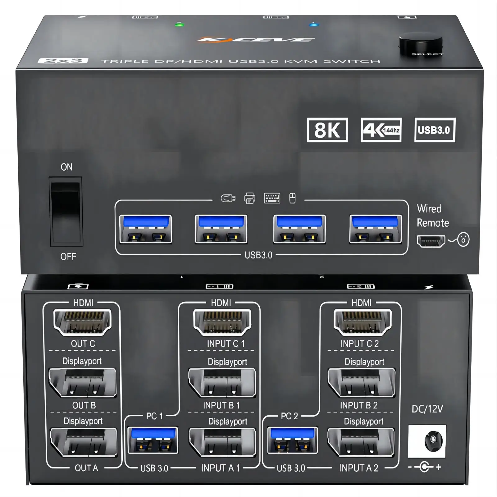 Comprar Conmutador KVM 3 Monitores 2 Computadoras 8K@60Hz 4K@144Hz, 2 Displayport + HDMI USB3.0 Conmutador KVM Triple Monitor con 4 puertos USB 3.0