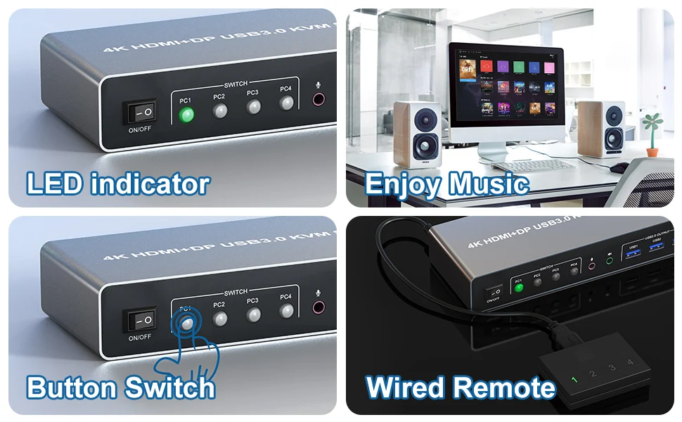 HDMI + DP Dual Monitor KVM Switch 4 computers share 2 monitor and 3 USB 3.0 devices, and Audio Microphone Ports