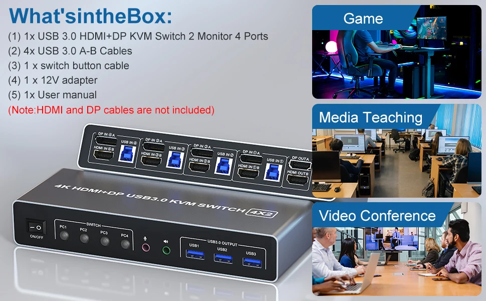 What You Get: This KVM Switch is equipped with 4 USB 3.0 cables and 1 desktop remote control and 1 power adapter. You need to prepare the HDMI/DP cables required to connect 4 computers and 2 monitor
