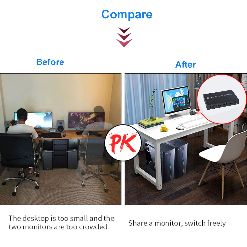 La caja KVM está diseñada con dos puertos de entrada compatibles con HDMI y un puerto de salida, que pueden conectar eficazmente dos hosts de computadora con un monitor.Los dos hosts de computadora también pueden usar el mismo conjunto de teclado y mouse, lo que hace que su escritorio de trabajo esté ordenado y ocupe menos espacio de instalación.