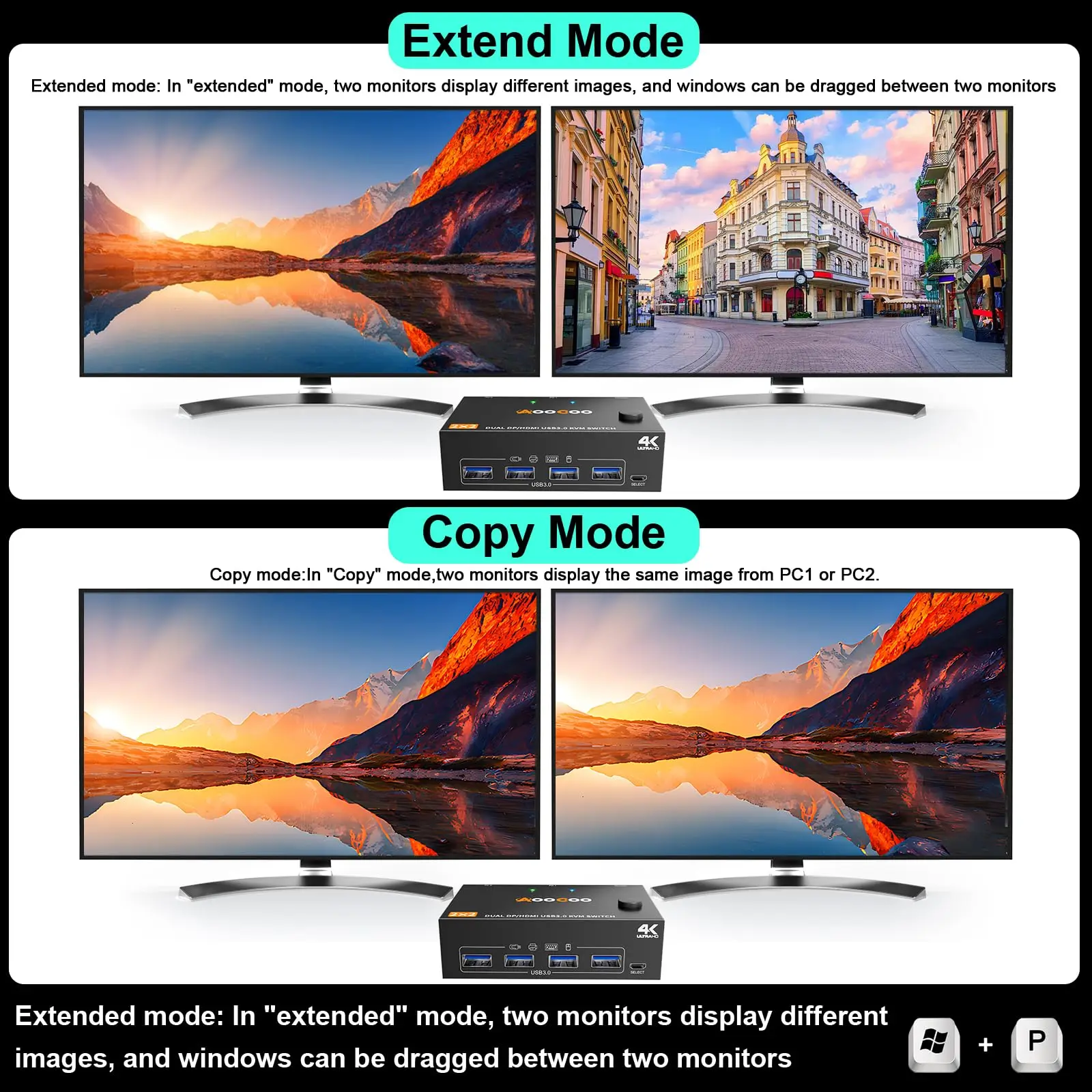 【Modo extendido y modo de copia】 Una vez completada la conexión, presione las dos teclas "WIN + P" en el teclado al mismo tiempo.Verás que aparezca una pequeña ventana.En este momento, puedes elegir el modo de extensión o el modo de copia.Además, seleccione el modo Extendido para ajustar la resolución de cada monitor.