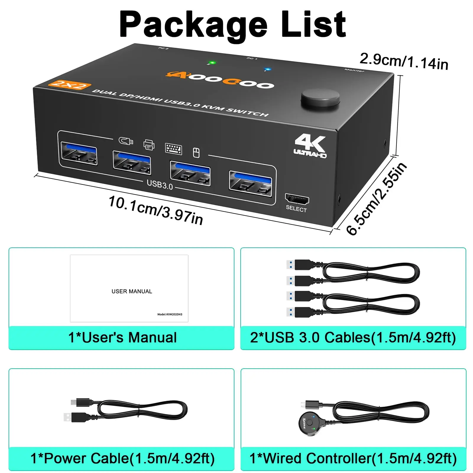 【Lista de paquetes】1 * Conmutador KVM USB3.0 de doble monitor + 2 * Cables USB3.0 (1,5 m/4,9 pies) + 1 * Control remoto con cable ((1,5 m/4,9 pies)) + 1 * Manual de usuario.