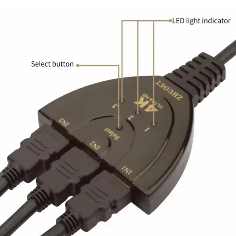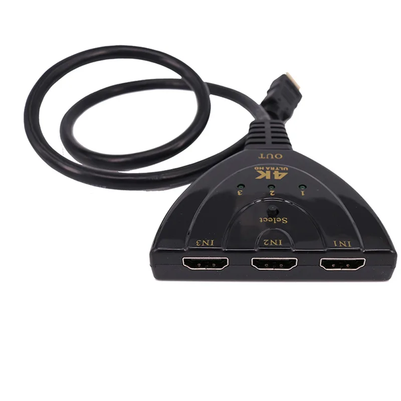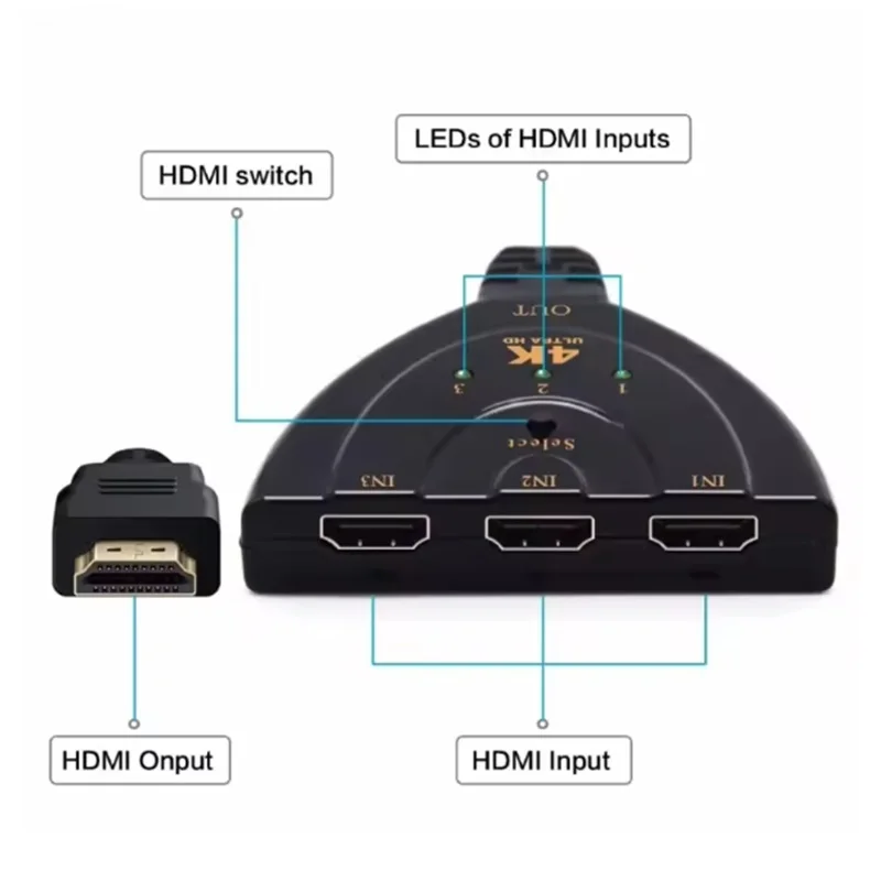 - El conmutador de 3 entradas a 1 salida compatible con HDTV enruta vídeo HD 4k*2k y audio digital desde cualquier 3 fuentes hasta la pantalla del dispositivo.