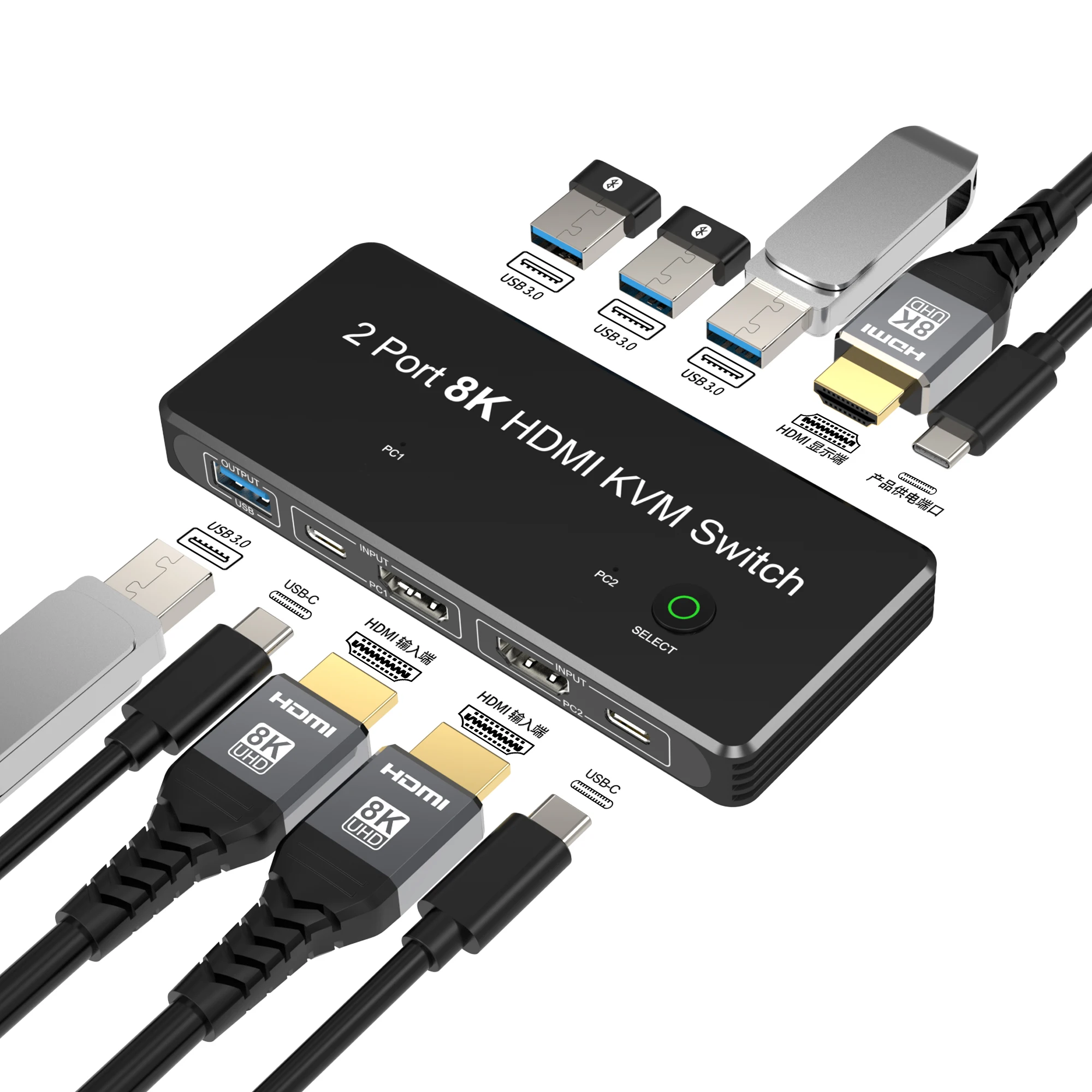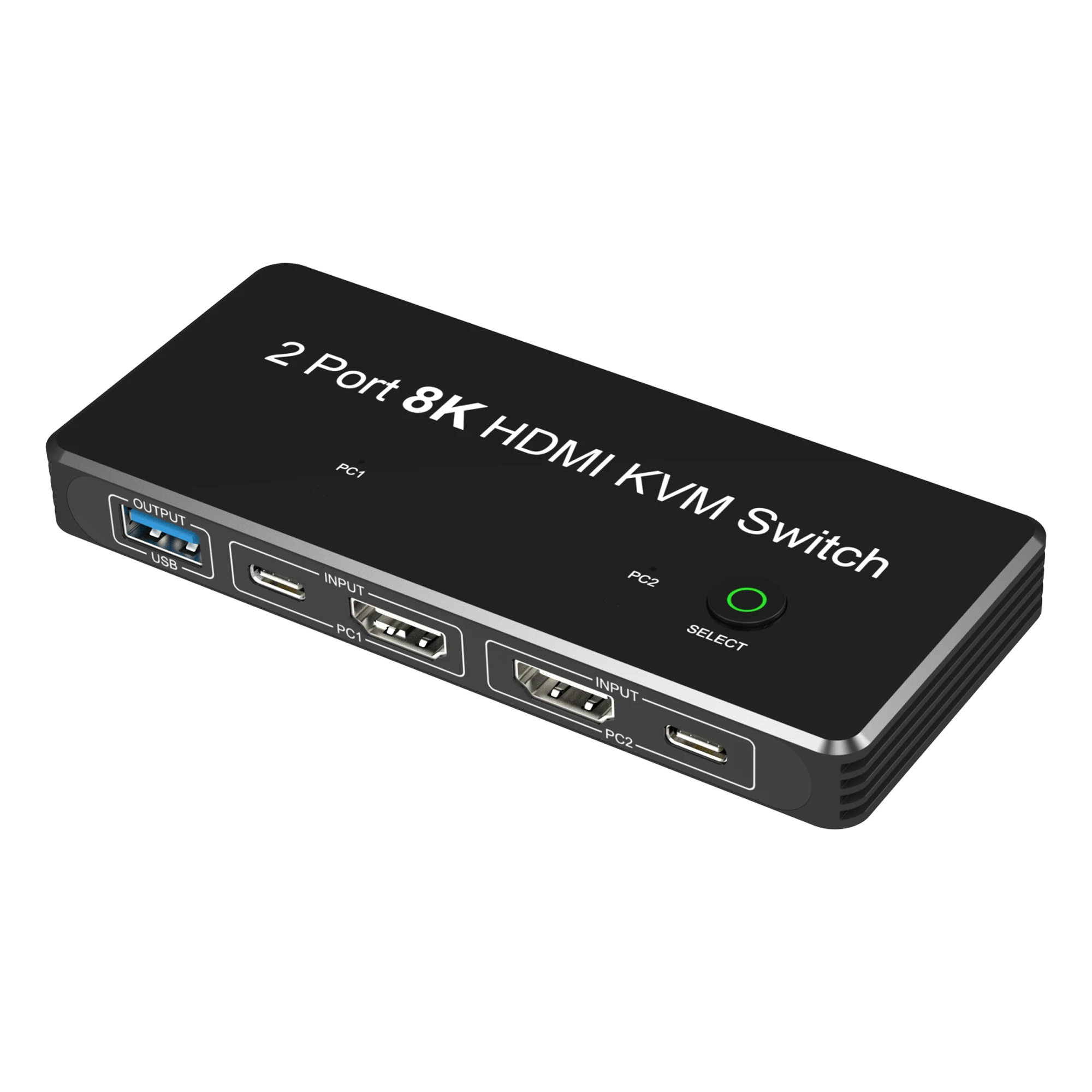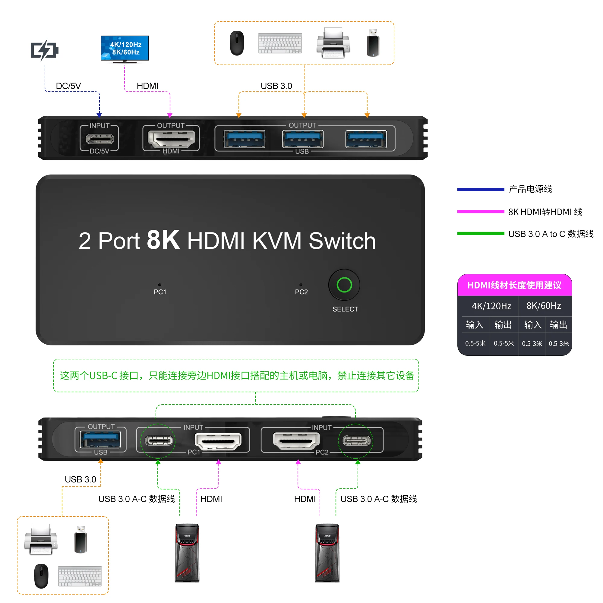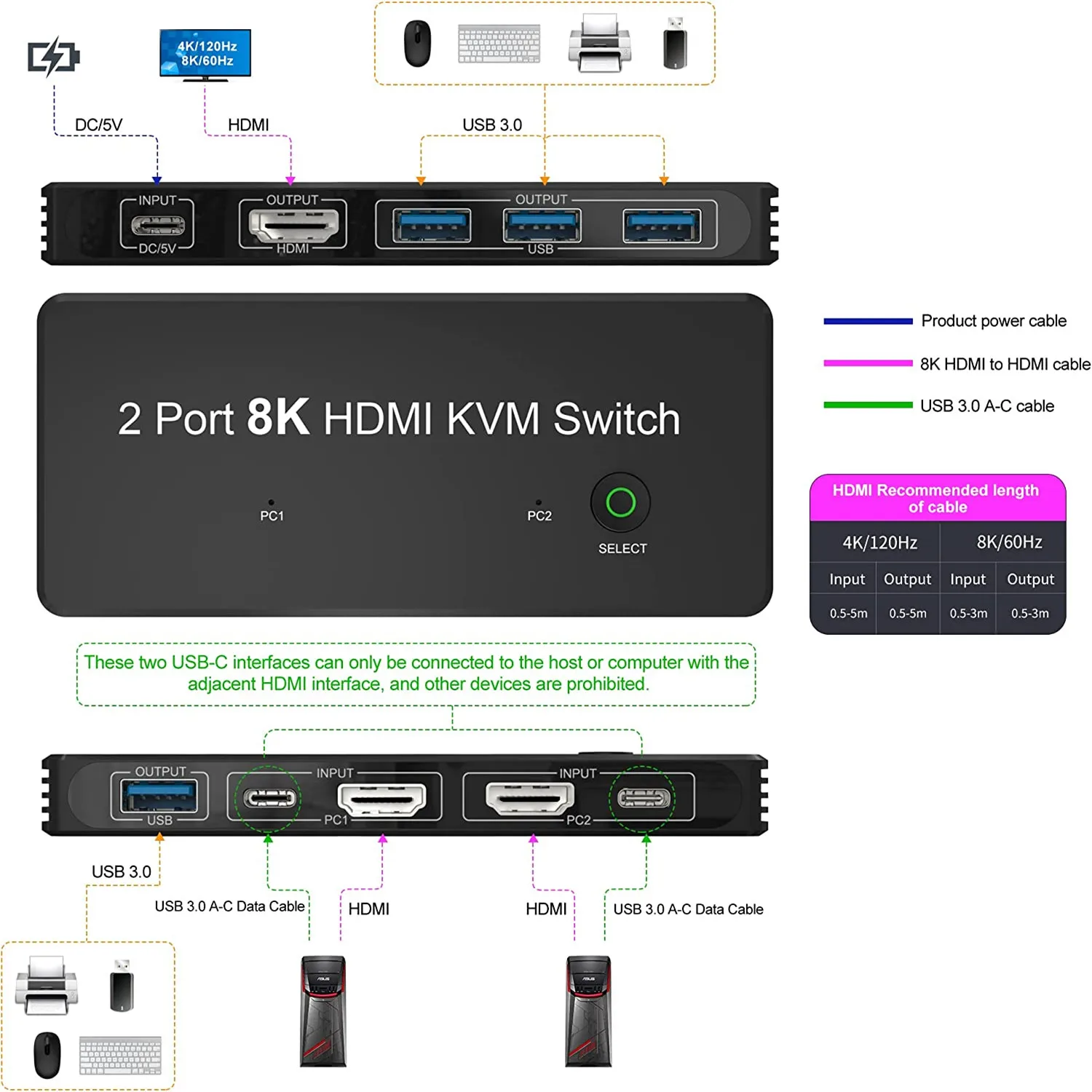 2 Port HDMI 2.1 8K KVM Switch,This HDMI Switchers allows you to connect from two PCs(via HDMI to HDMI or mini dp to HDMI,usb-c to HDMI,DP to HDMI cables) to One Monitors(via HDMI to HDMI or HDMI to DP cables),you can press"SELECT"button to switch between two pcs.***While using,plugging one USB-A to USB-C cable in "Input DC/5V Port"to your USB Devices to power the switch is necessary.
