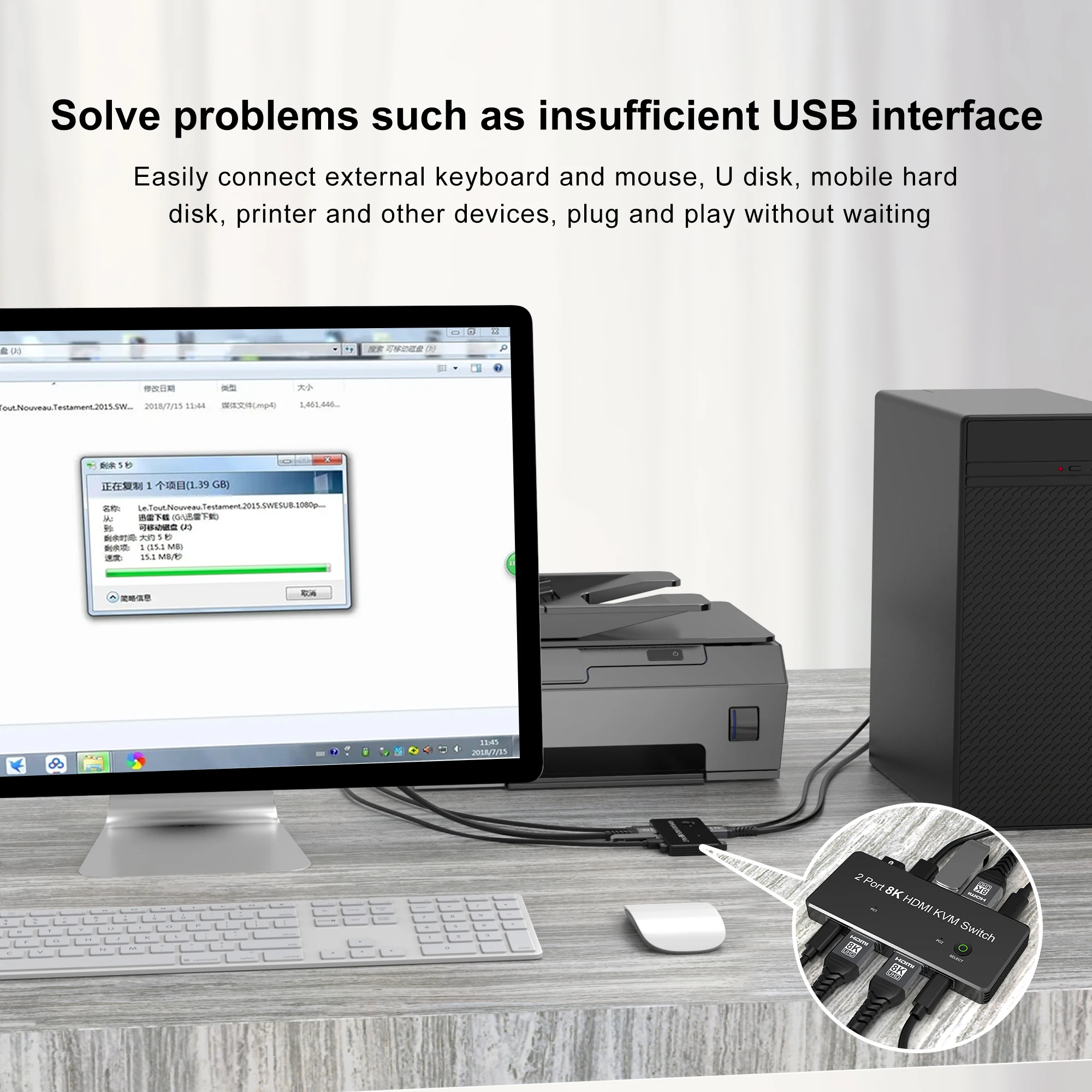 Widely used in many occasions,this HDMI 2.1 KVM Switch can be used in many occasions, solve the problem of lack of USB devices**.If you have two pcs,but you have only one set of keyboard,mouse,u-disks,by using our This KVM Switch,you can easily to control two of your computers by pluging mouse,keyboard,U-disks in our switcher's USB Output Port(Switch between two PCs).