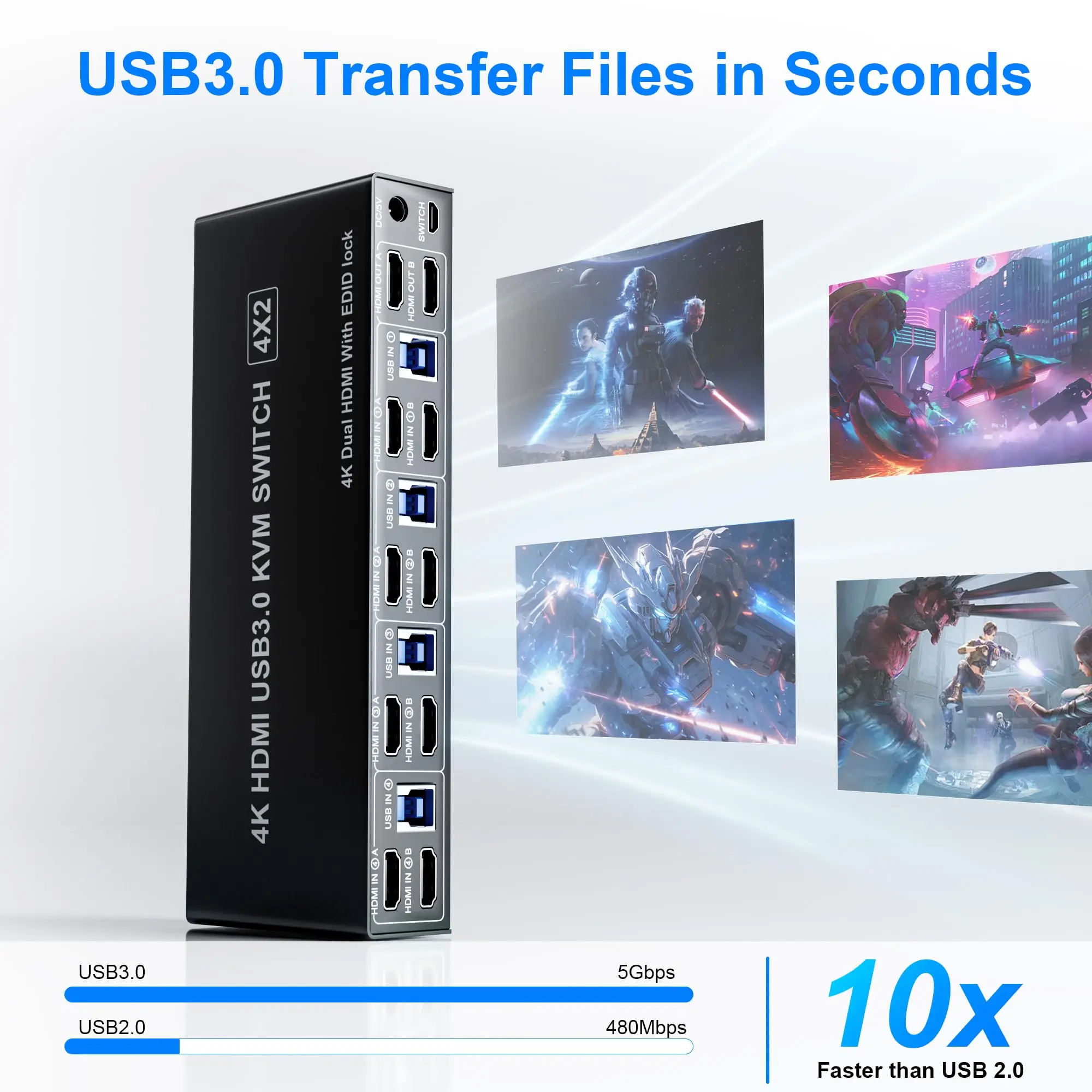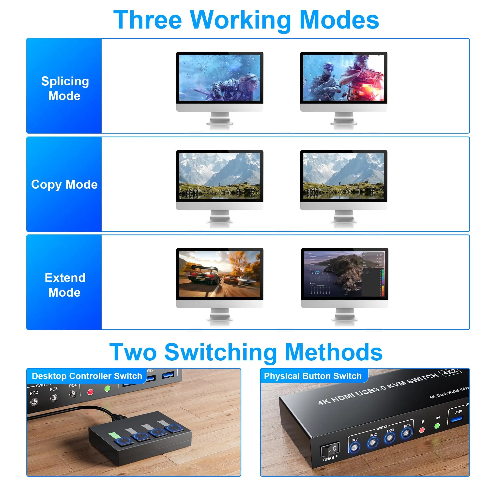 Monitores duales con conmutador KVM HDMI de 4 puertos USB 3.0:Este conmutador KVM HDMI+HDMI de doble monitor puede compartir un monitor dual HD 4K@60Hz, 3 dispositivos USB 3.0 y un dispositivo auricular y micrófono entre 4 computadoras.Este conmutador KVM de monitor dual HDMI 4 EN 2 OUT le permite controlar 4 computadoras o portátiles con un conjunto de teclado, mouse y monitores duales.Solo cuando su computadora admite pantalla dual o pantalla múltiple, puede usar este KVM para compartir 2 monitores.(Los modos de visualización espejado, extendido o empalmado dependen de la tarjeta gráfica de su computadora).
