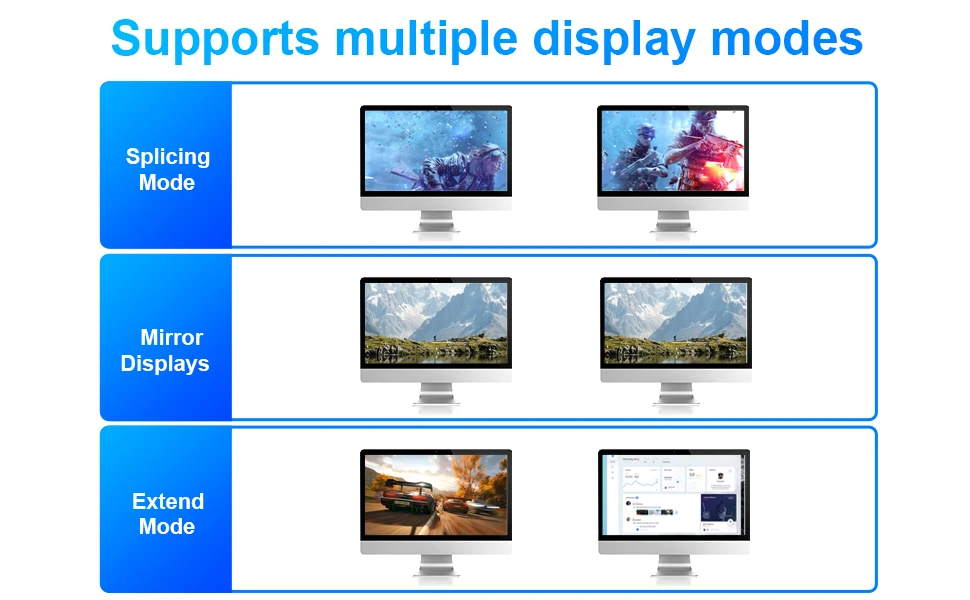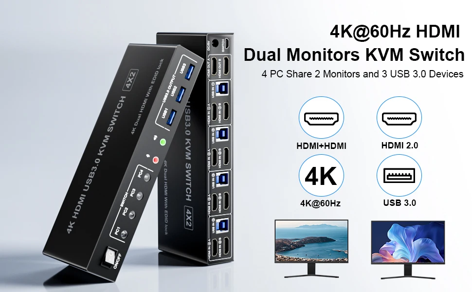 Este conmutador KVM HDMI de doble monitor Admite una resolución máxima de hasta 4K 60Hz YUV 4:4:4, HDCP 1.4, HDR 2.2, con emulador EDID; La salida de monitores duales admite hasta 4K@60Hz para una visualización extendida, espejada o empalmada (depende de la tarjeta gráfica de su computadora);