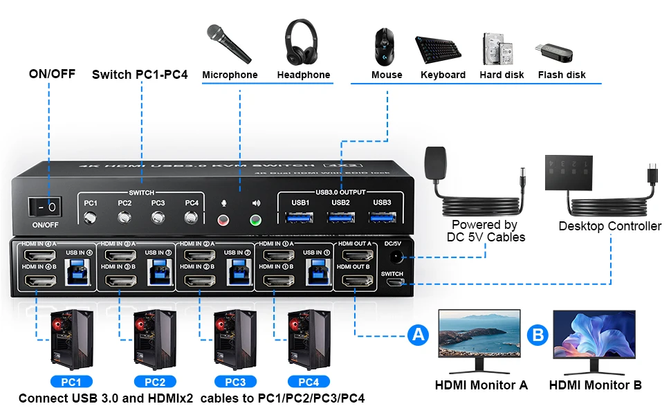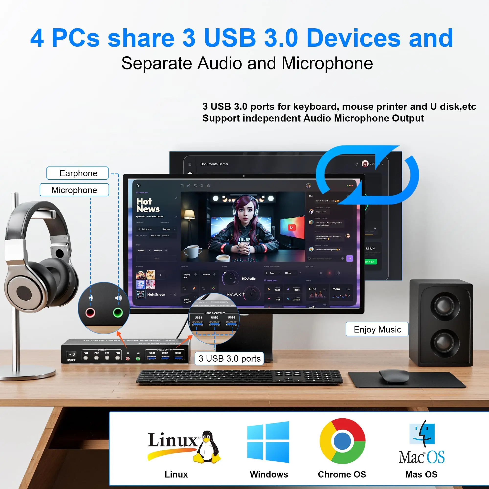 4 computadoras comparten un conjunto de teclado, mouse, 2 monitores y más periféricos USB 3.0.
