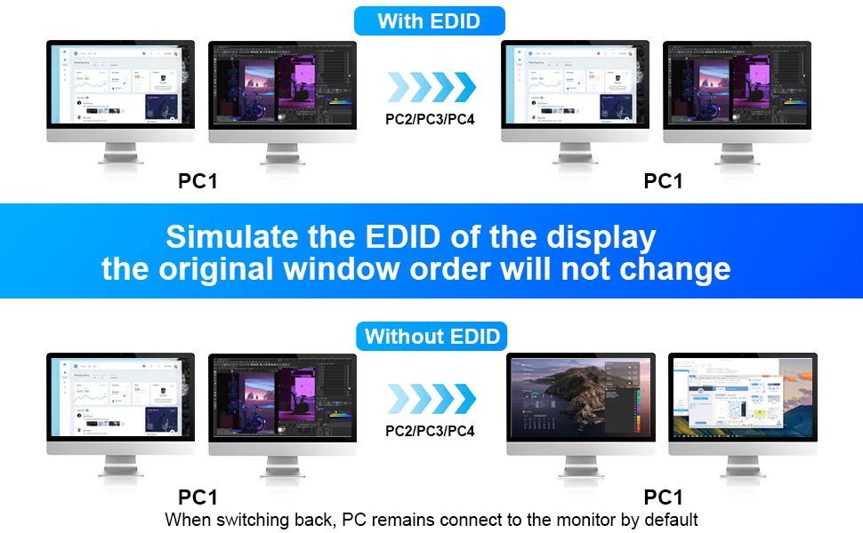 Con simulación EDID:Este interruptor de monitor dual KVM puede simular el EDID de la pantalla, almacenar la tasa de configuración de la pantalla, viene con emuladores EDID en cada puerto de entrada, manteniendo cada PC siempre información de visualización correcta.Libérelo de la molestia de ajustar constantemente la configuración de la pantalla.Sin EDID, sus ventanas pueden moverse al cambiar.Otra característica de EDID es la capacidad de identificar automáticamente la mejor resolución.