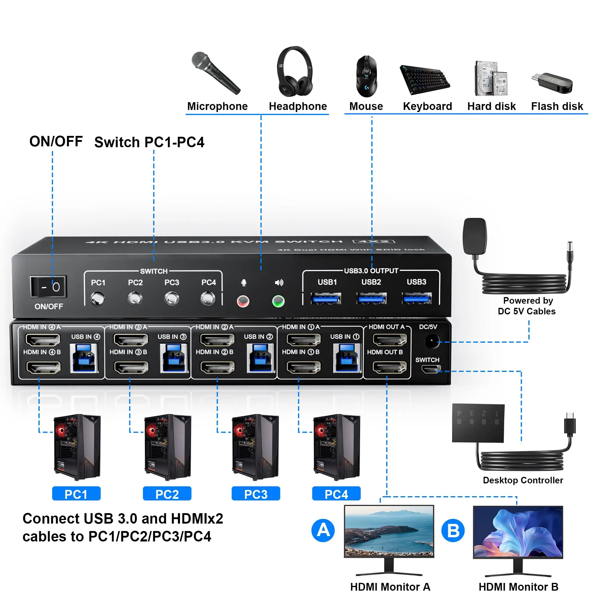 Comprar Conmutador KVM Displayport + HDMI 4K @ 60Hz 4 ordenadores 2 monitores, conmutador KVM USB 3,0 HDMI DP Monitor Dual 4 PC con micrófono de Audio