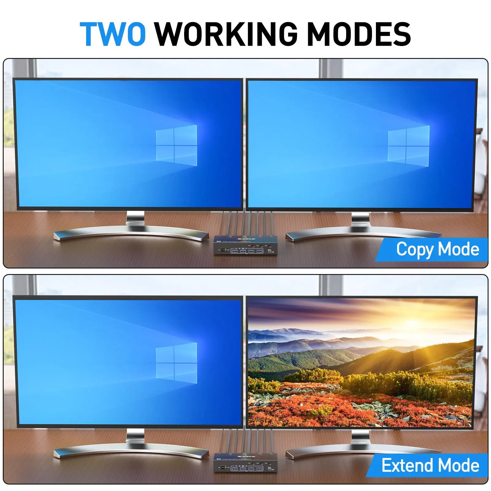 【Modo extendido y modo de copia】El conmutador KVM DP de monitor dual admite el modo extendido (las pantallas de visualización de los dos monitores son diferentes) y el modo de copia (las pantallas de visualización de los dos monitores son idénticas).Seleccionar el modo de visualización según sus necesidades puede mejorar en gran medida la eficiencia de su trabajo y facilitar su vida.
