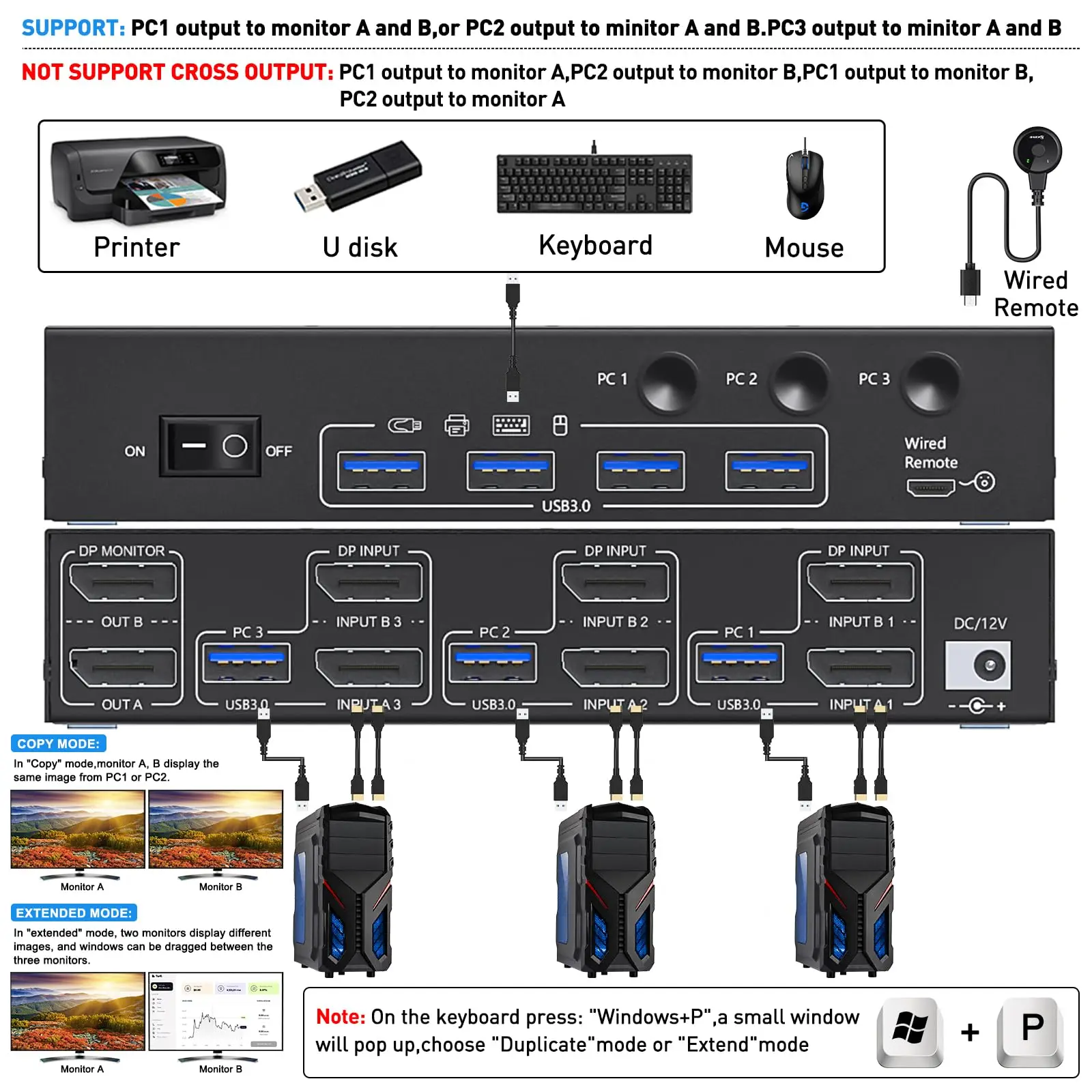 【Conmutador KVM de monitor dual para PC 3/4】Este conmutador KVM DP de monitor dual permite que 3/4 computadoras/latops compartan 2 monitores y 1 juego de teclado y mouse.Puede hacer que su espacio de trabajo ordenado y eficiente, y también es una opción premium para trabajar desde casa.▲▲▲NOTA: Solo cuando sus computadoras admiten 2 monitores o monitores múltiples, puede usar este KVM para lograr una PC de 3/4 para compartir 2 monitores.