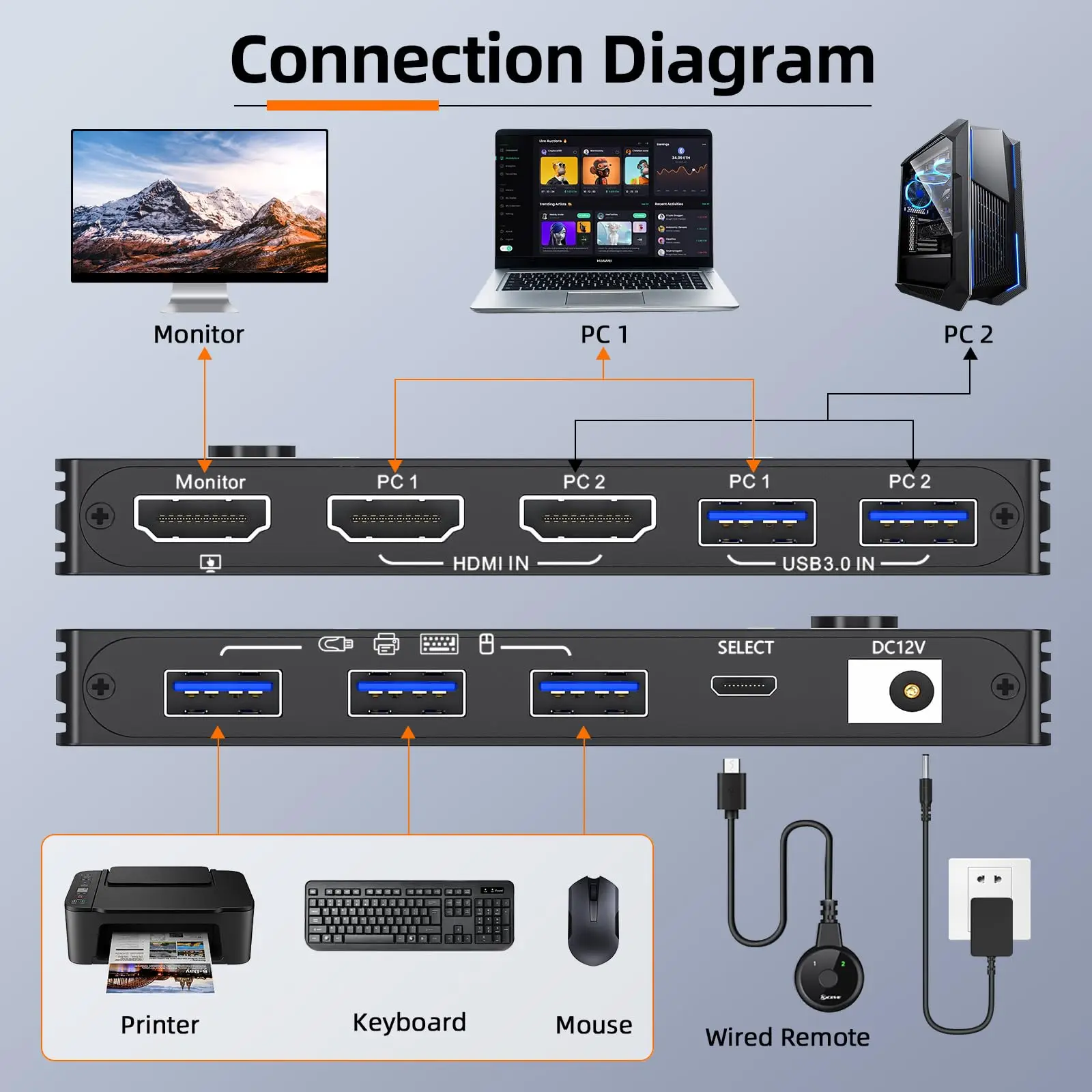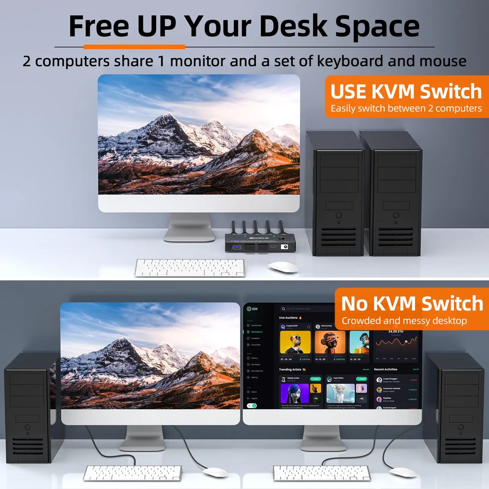【Conmutador KVM USB 3.0 1 monitorea 2 computadoras】El conmutador KVM HDMI de 8K de 2 puertos puede controlar 2 computadoras para compartir 1 monitor con 1 juego de teclado y mouse con cable o inalámbrico. Puede cambiar rápidamente entre dos computadoras (2-5 segundos).