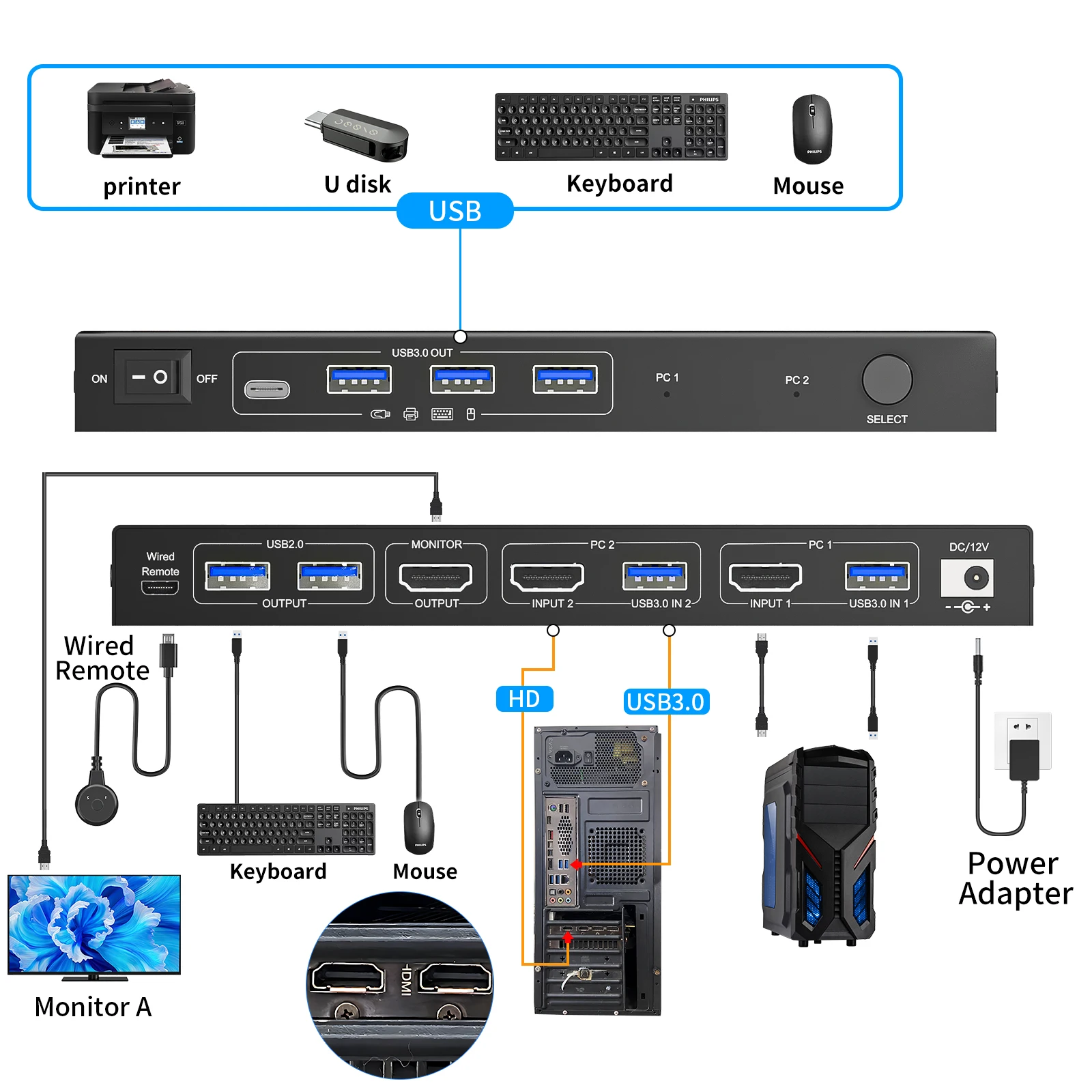 【Conmutador HDMI KVM con 3 puertos USB 3.0/6 puertos USB 3.0】El interruptor de monitor para 2 computadoras viene con3 puertos USB 3.0/6 puertos USB 3.0 (3 USB3.0 + 1 Tipo C + 2 USB 2.0)para compartir dispositivos USB, como teclado para juegos, mouse, impresora y disco duro.Admite USB 3 ultrarrápido.0 transferencia de datos hasta 5 Gbps, 10 veces más rápida que USB2.0.El adaptador de corriente CC de 12 V actualizado resuelve completamente el problema de la identificación inestable para dispositivos USB de alta potencia.