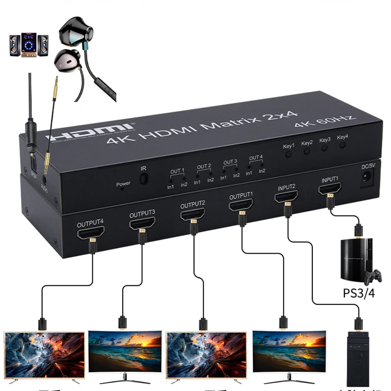 Comprar Conmutador de matriz HDMI 2x4 4x2 4K 60Hz Matrix HDMI2.0 divisor de interruptor 2 en 4 salidas con salida de Audio óptica de 3,5mm con control remoto IR HDCP2.2
