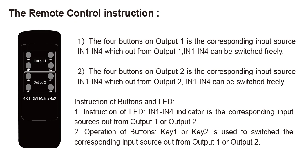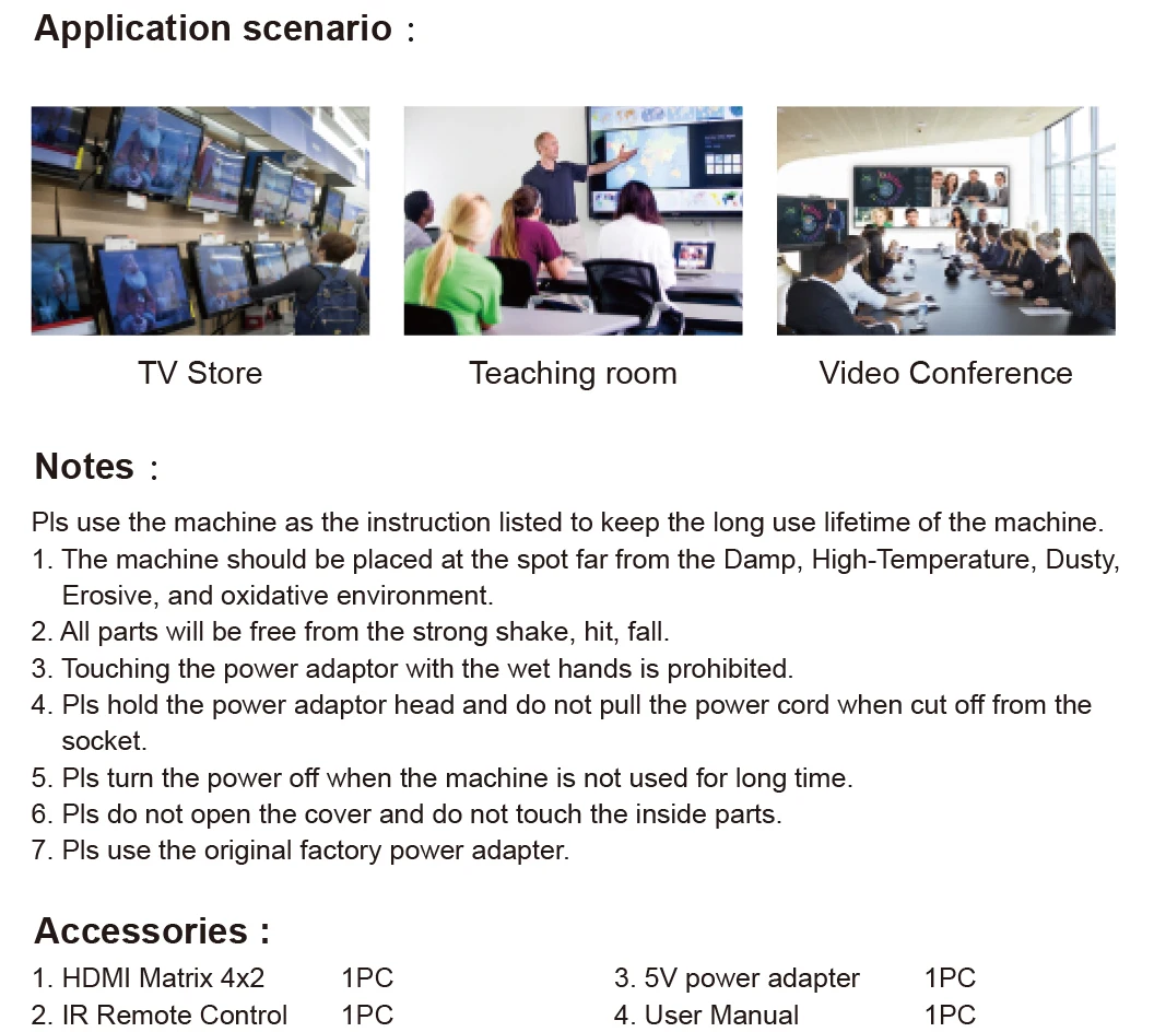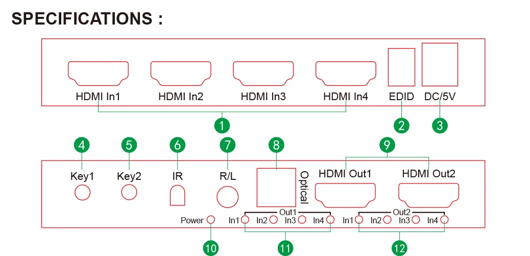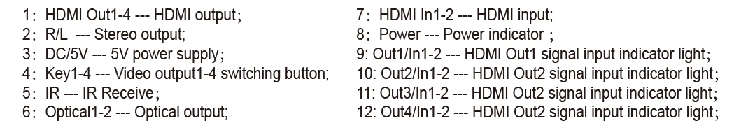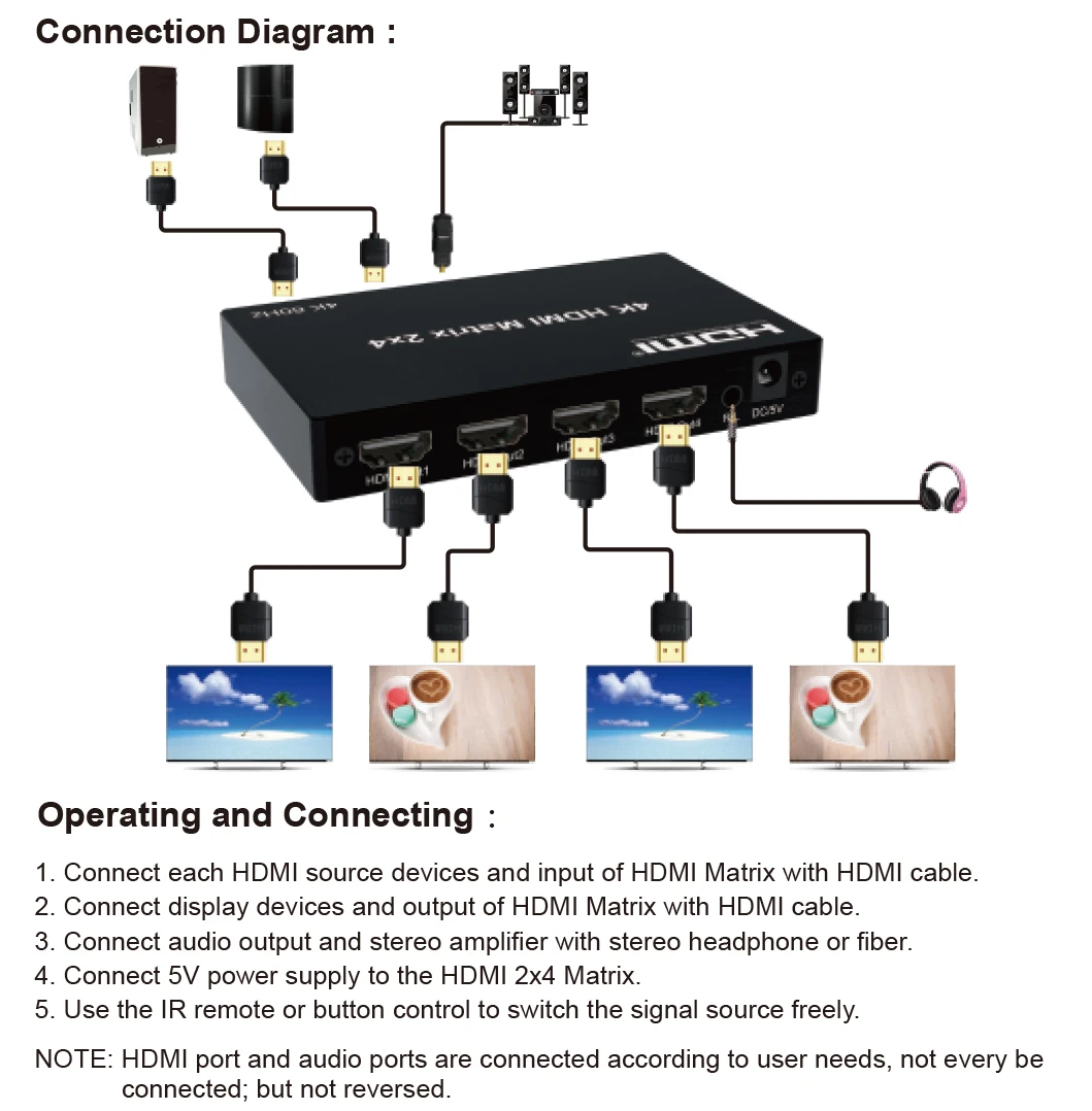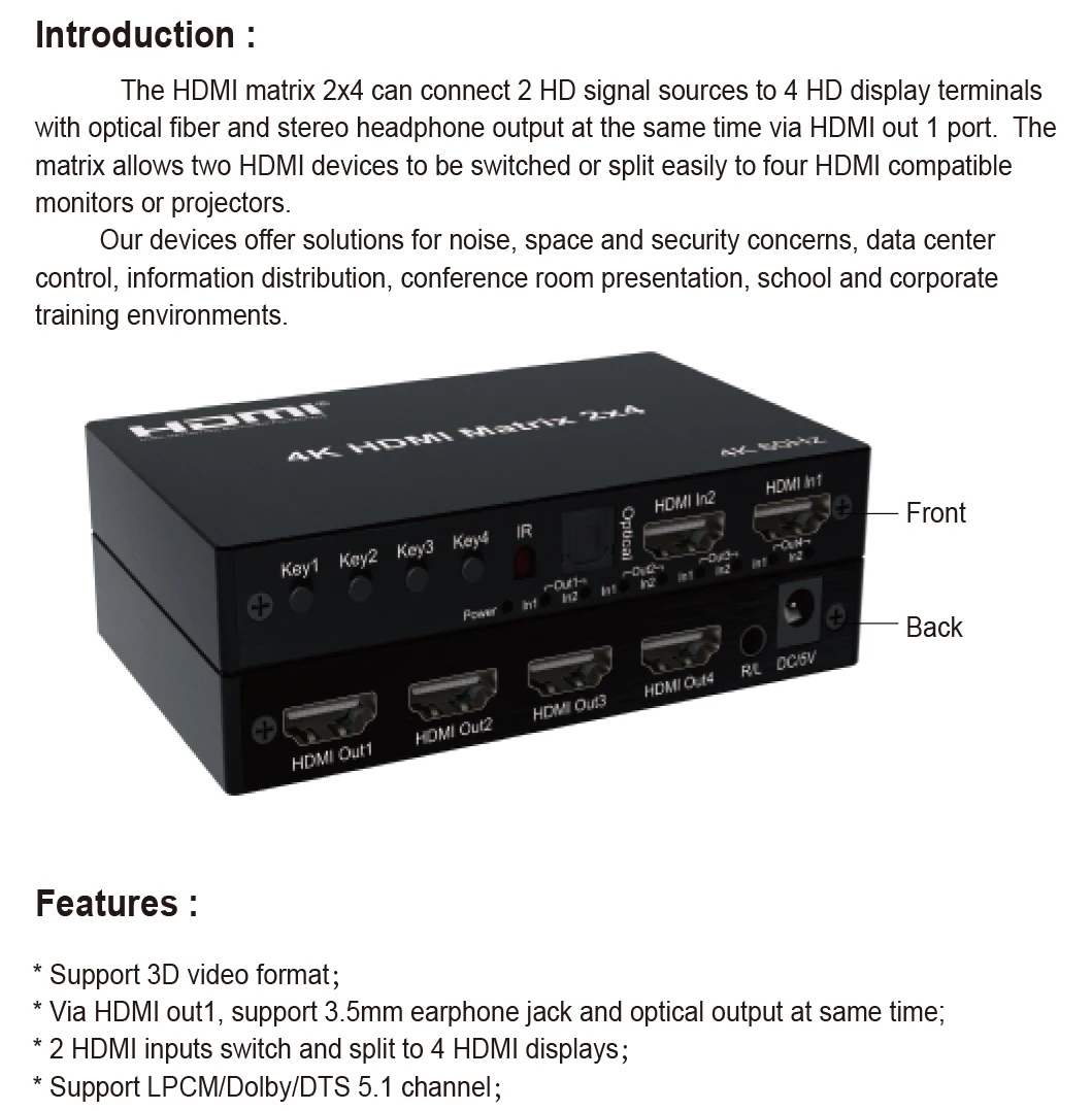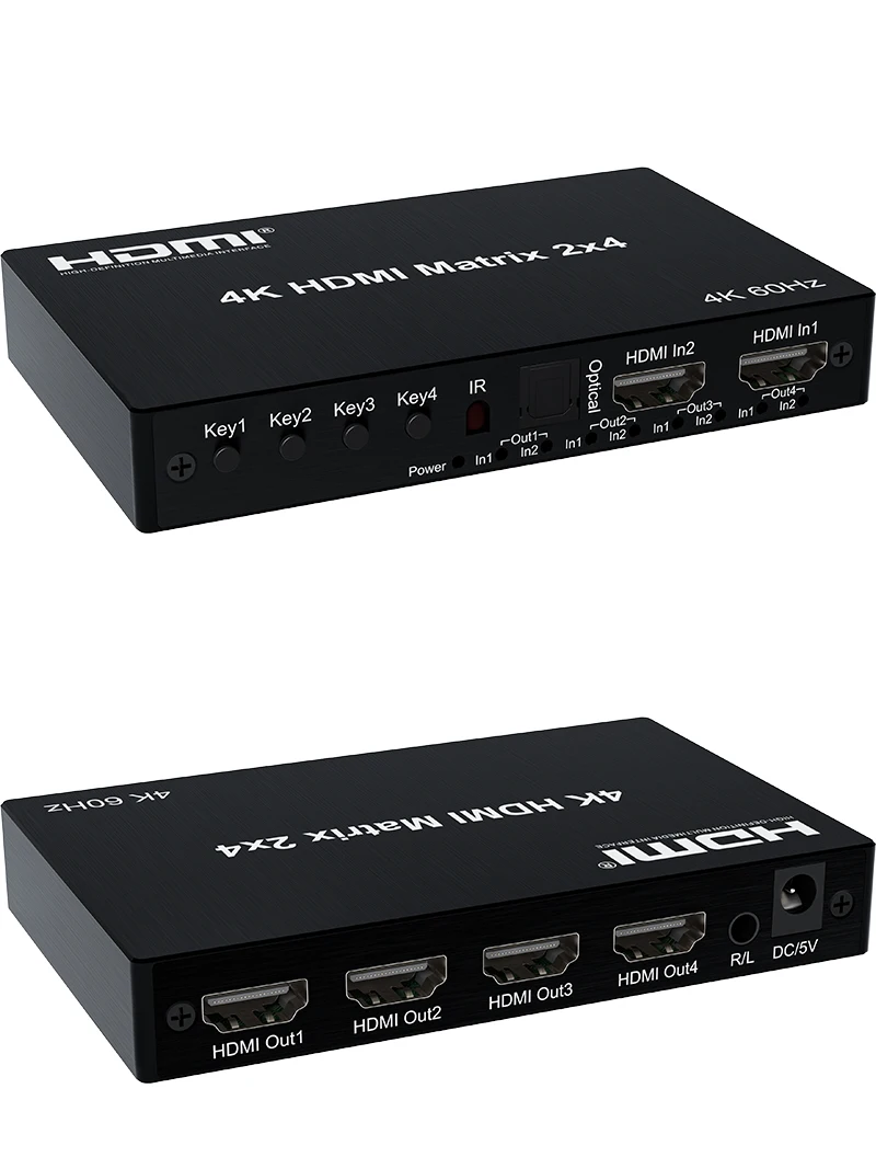 La matriz HDMI 4x2 puede conectar 4 fuentes de señal HD a 2 terminales de pantalla HD con fibra óptica y salida de auriculares estéreo al mismo tiempo a través de 1 puerto HDMI.