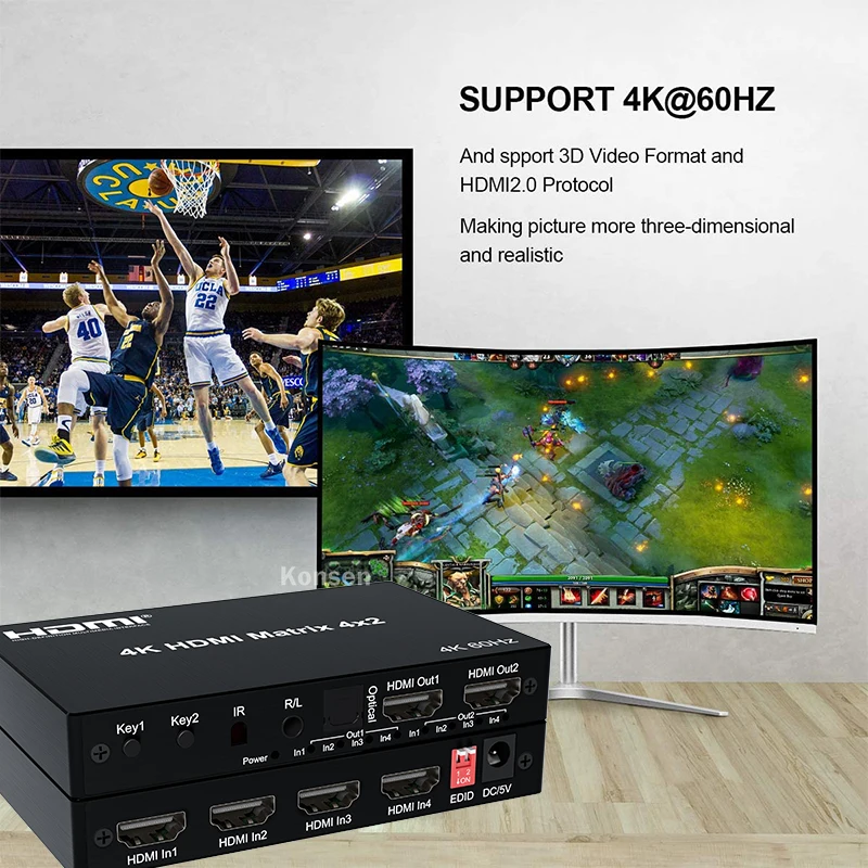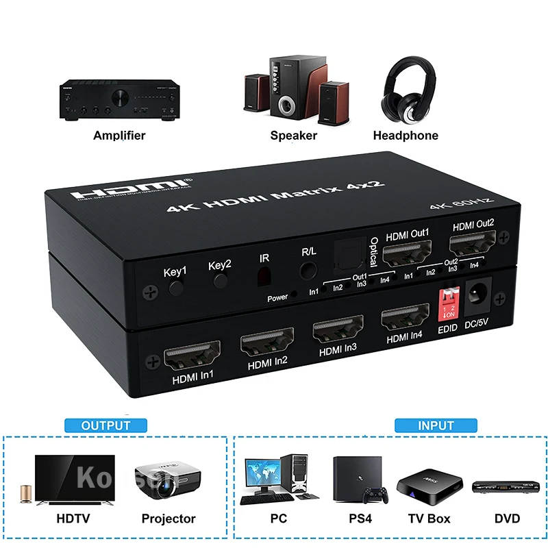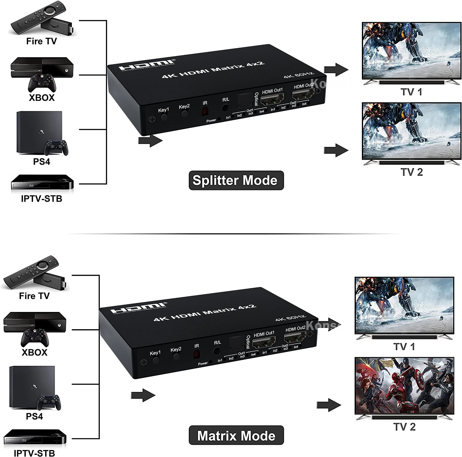 Comprar Conmutador de matriz HDMI 4K 60Hz 4x2 2x4, divisor de matriz HDMI 4 en 2 con Extractor de Audio óptico de 3,5mm con control remoto IR
