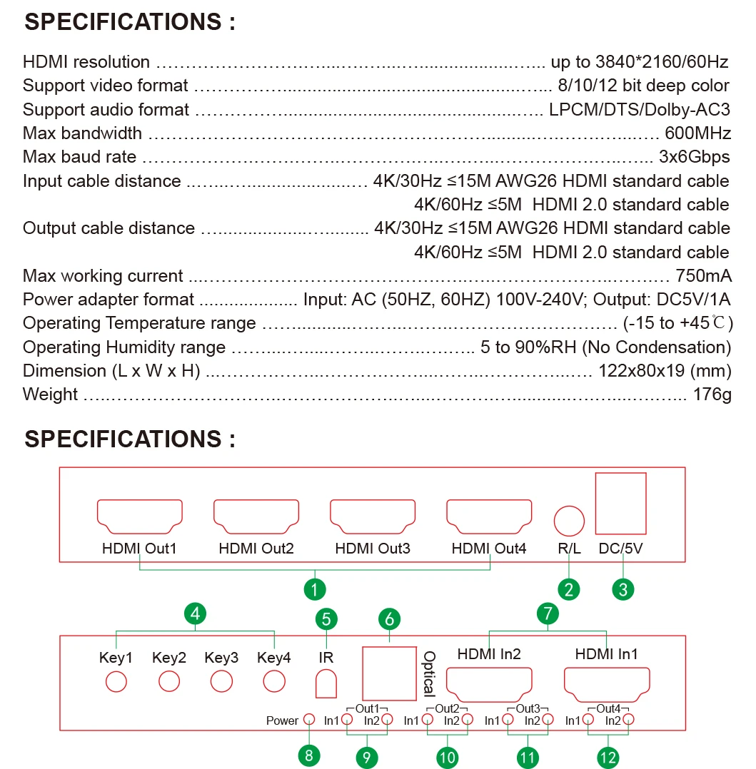 Distancia del cable de salida. ................................ Cable estándar 4K/30Hz ≤ 15M AWG26 HDMI