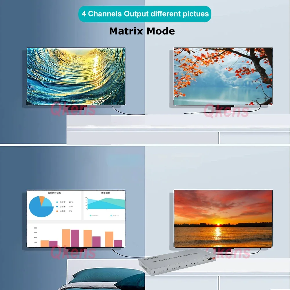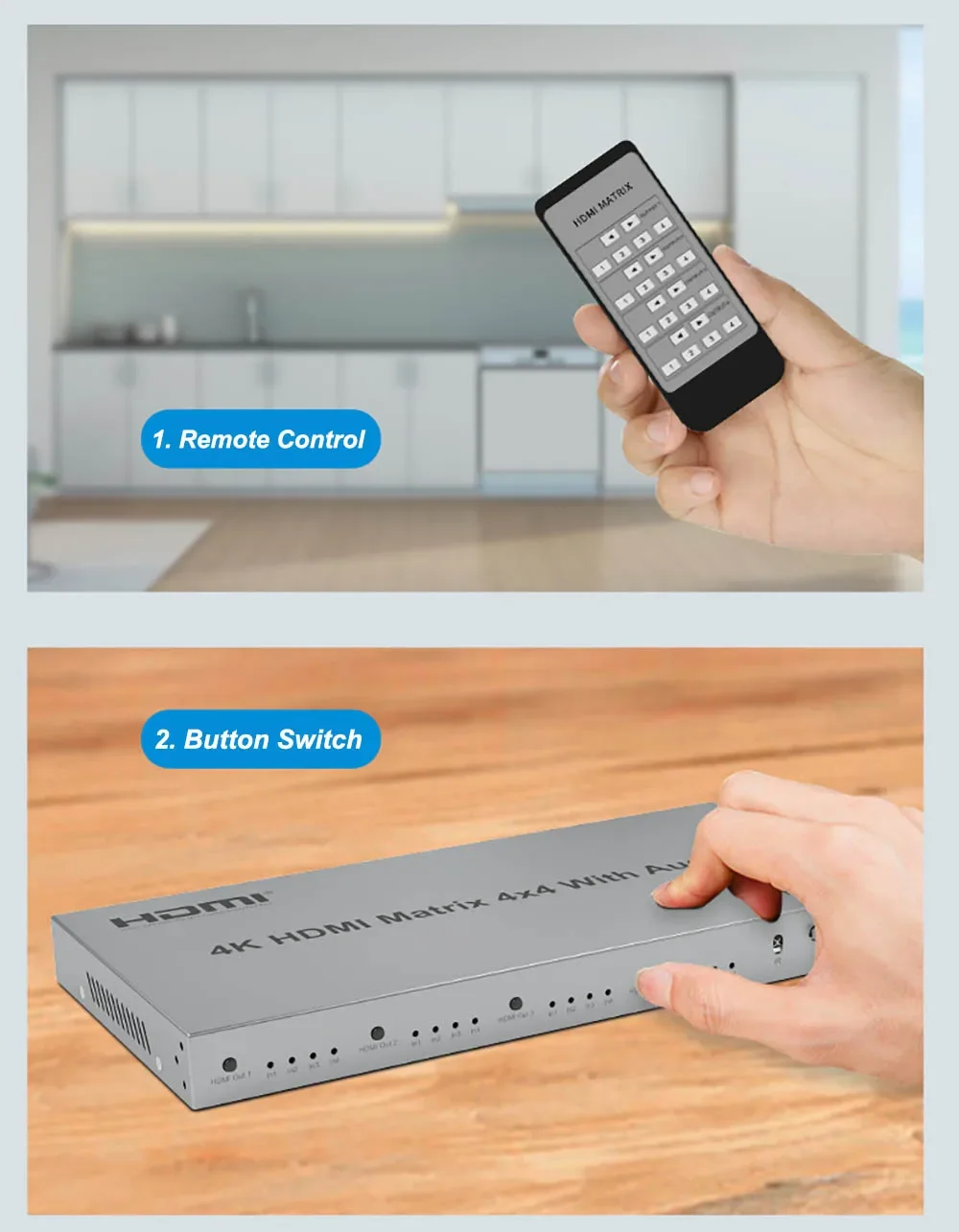 Esta matriz HDMI 4x4 puede conectar 4 fuentes de señal HD a 4 terminales de pantalla HD con fibra óptica y estéreo. salida de auriculares al mismo tiempo a través del puerto de salida HDMI 1.