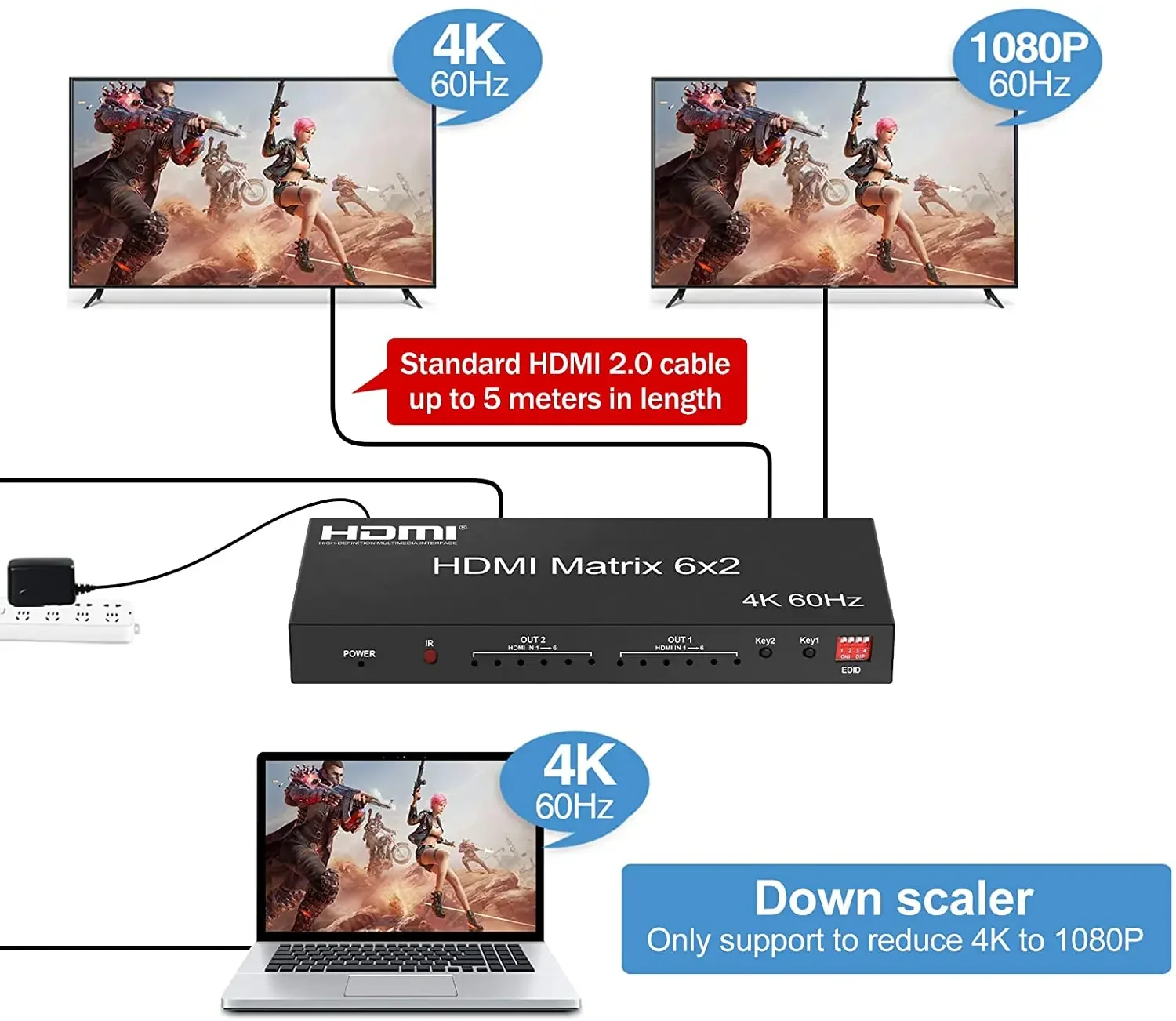 Comprar Conmutador de matriz HDMI 6x2, 4K, 60Hz, matriz HDMI, 6 en 2 salidas, divisor de conmutador de vídeo con Extractor de Audio óptico R/L para PC, Loptop TV