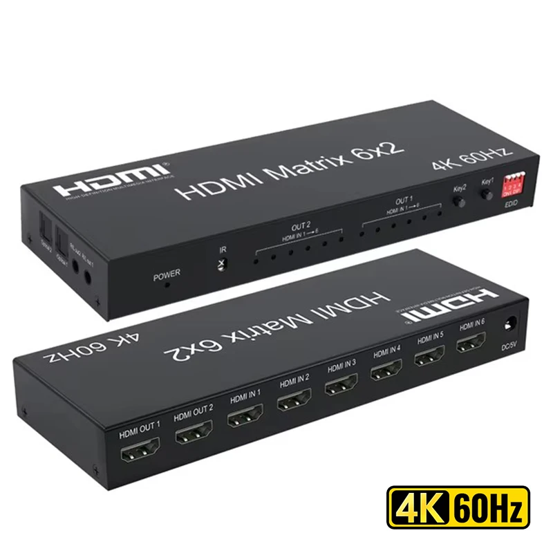 Conmutador de matriz HDMI 6x2, 4K, 60Hz, matriz HDMI, 6 en 2 salidas, divisor de conmutador de vídeo con Extractor de Audio óptico R/L para PC, Loptop TV