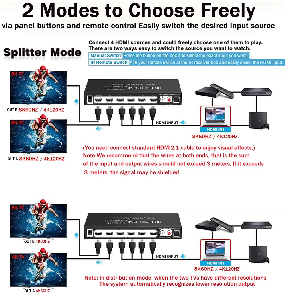 2. Conecte preferentemente un televisor de 8K a OUTB.OUTA genera una resolución de 8K@60 o 4K@120 solo en modo dividido