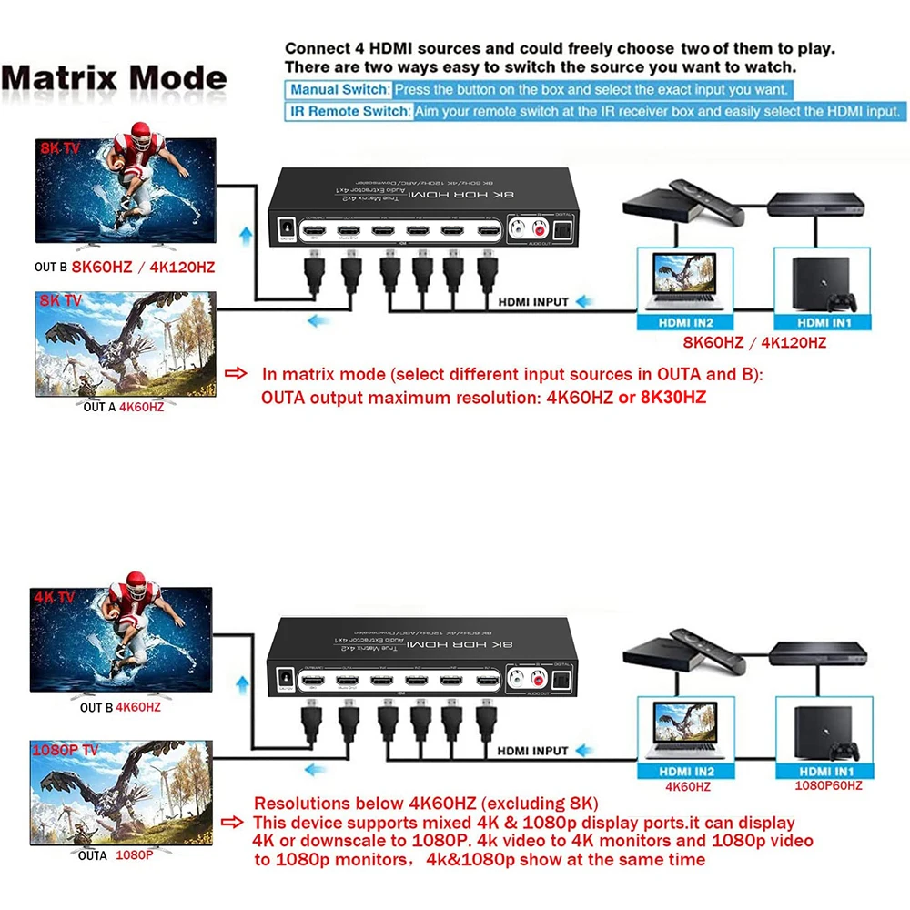 Comprar Conmutador de matriz HDMI2.1 8K, divisor de interruptor HDMI de matriz 4x2, 4 entradas, 2 salidas con Extractor de Audio óptico L/R 5,1 canales ARC 4K @ 120Hz HDR 3D