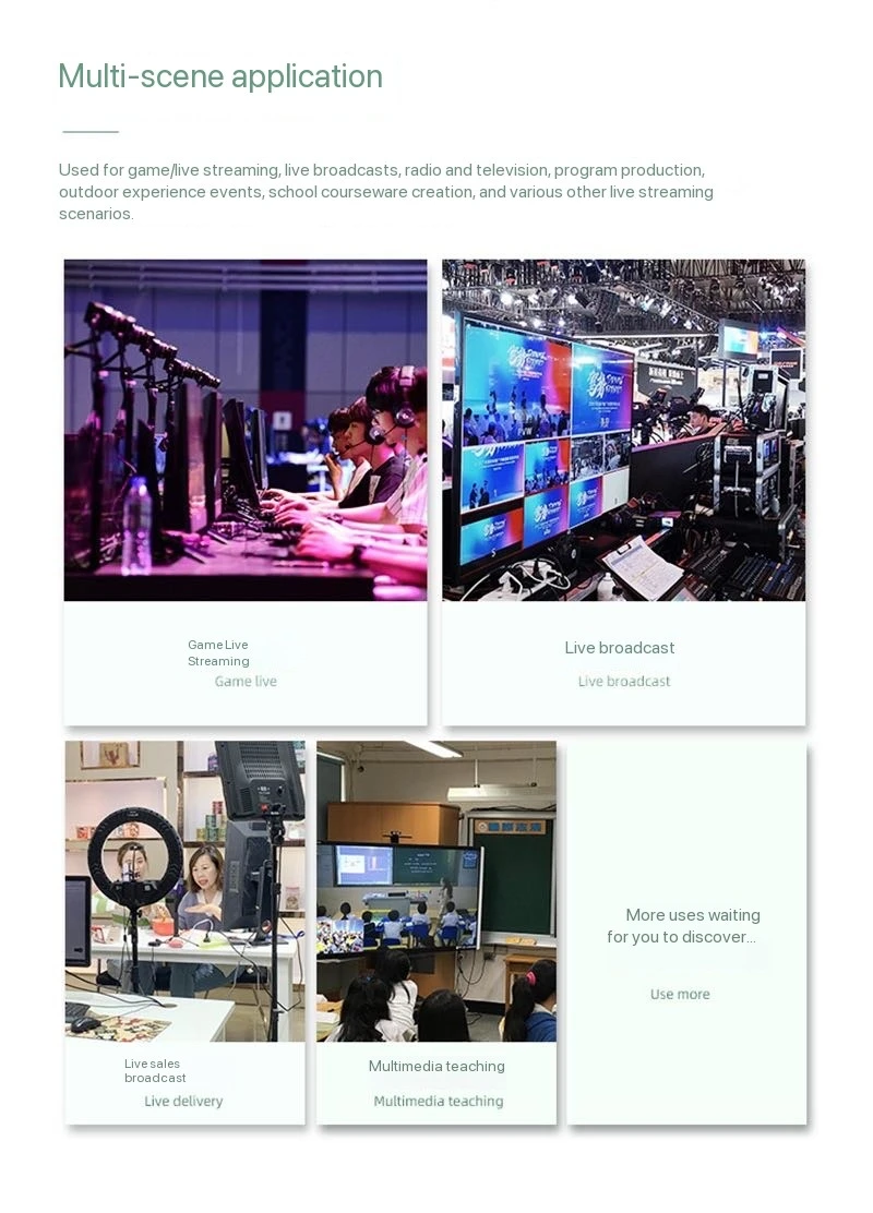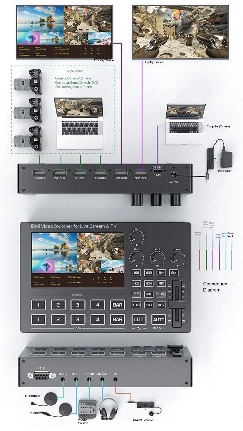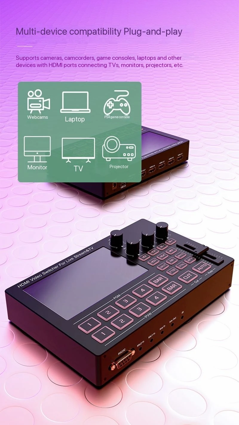 Este conmutador de vídeo de 4 vías para transmisión en vivo admite 4 resoluciones de entrada HDMI 1920X1080@60Hz, La resolución de salida es 1920X1080@60Hz y admite el estándar HDCP1.4. Admite audio integrado HD o audio analógico externo, después de un procesamiento mixto, se puede integrar en la señal HD de salida o salida desde el puerto analógico.Vista previa en tiempo real con pantalla IPS HD integrada de 5 pulgadas, Adecuado para producción de programas, producción in situ de entrevistas y discursos, exteriores. experimente eventos, producción de material didáctico escolar y otras necesidades de conmutación de video. Se puede utilizar en transmisión en vivo y en varios lugares de eventos.