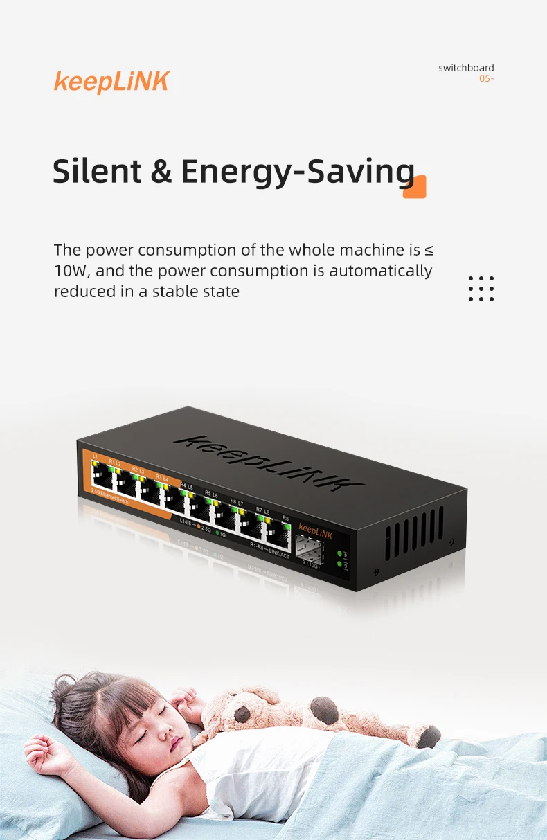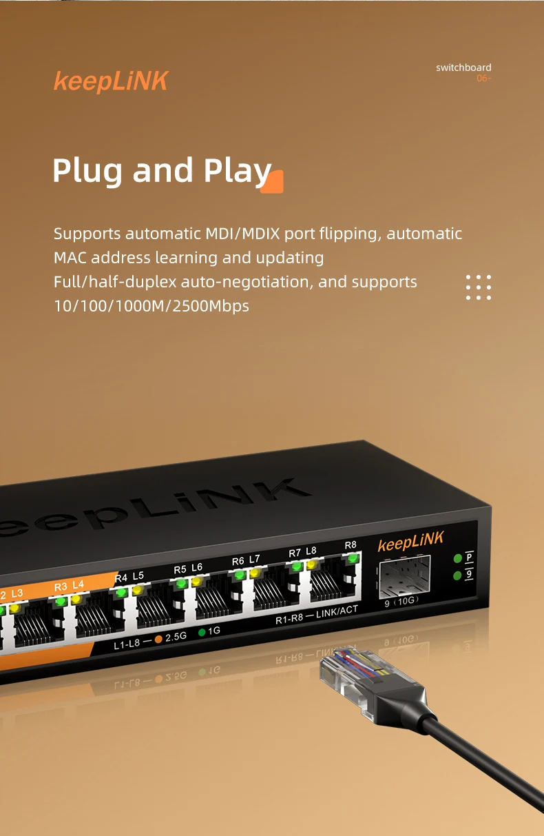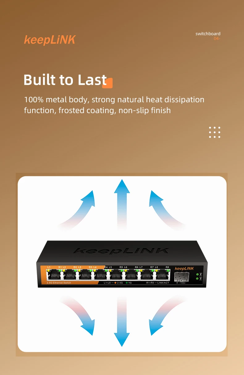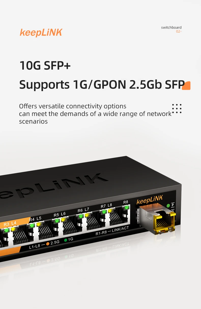 El conmutador no administrado Multi-Gigabit de 9 puertos KeepLink, KP-9000-9XH-X, ayuda a las empresas a expandir sus redes de manera efectiva con velocidades multigig.El conmutador Ethernet Multi-Gigabit KP-9000-9XH-X viene con ocho puertos (8) 2,5 G y un (1) puerto SFP+ de 10 G en una carcasa metálica y se puede colocar en un escritorio o montar en una pared con el montaje en pared incluido. kit.Este interruptor es energéticamente eficiente, está diseñado para durar y rigurosamente probado para brindar la confiabilidad que las empresas necesitan.La prioridad del tráfico 802.1p y el soporte de cuadros gigantes permiten una integración perfecta con redes más sofisticadas.
