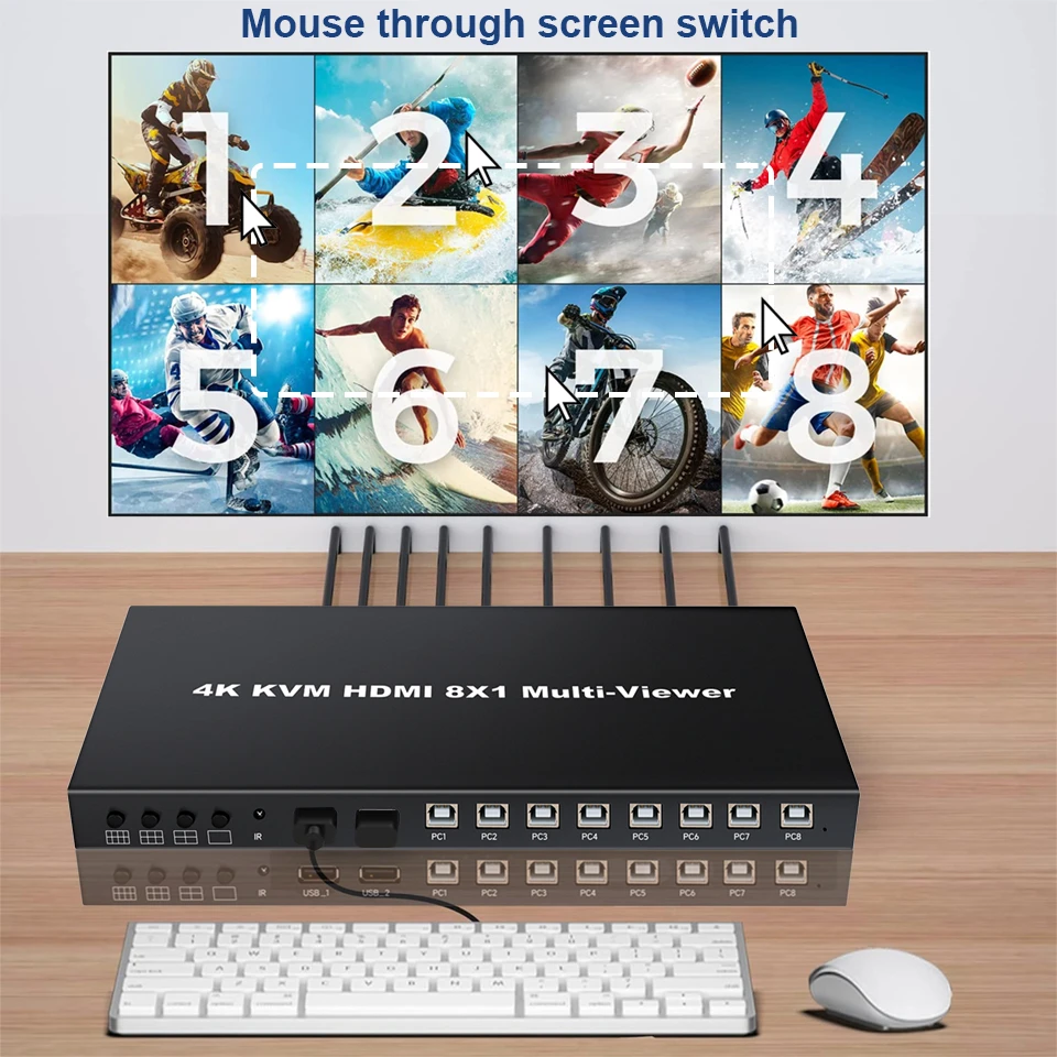 4K HDMI-compatible KVM Multiviewer 8x1 1080P Quad Screen Multi Viewer HDMI Multi-Viewer Splitter Conmutador sin costuras con IR para PC a HDTV