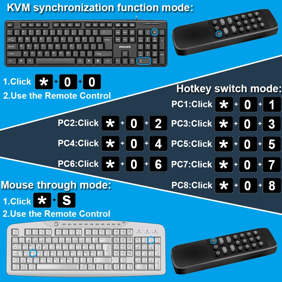 Modo de función de sincronización KVM: haga clic en * + 0 + 0 tecla de acceso rápido o control remoto para encenderlo;