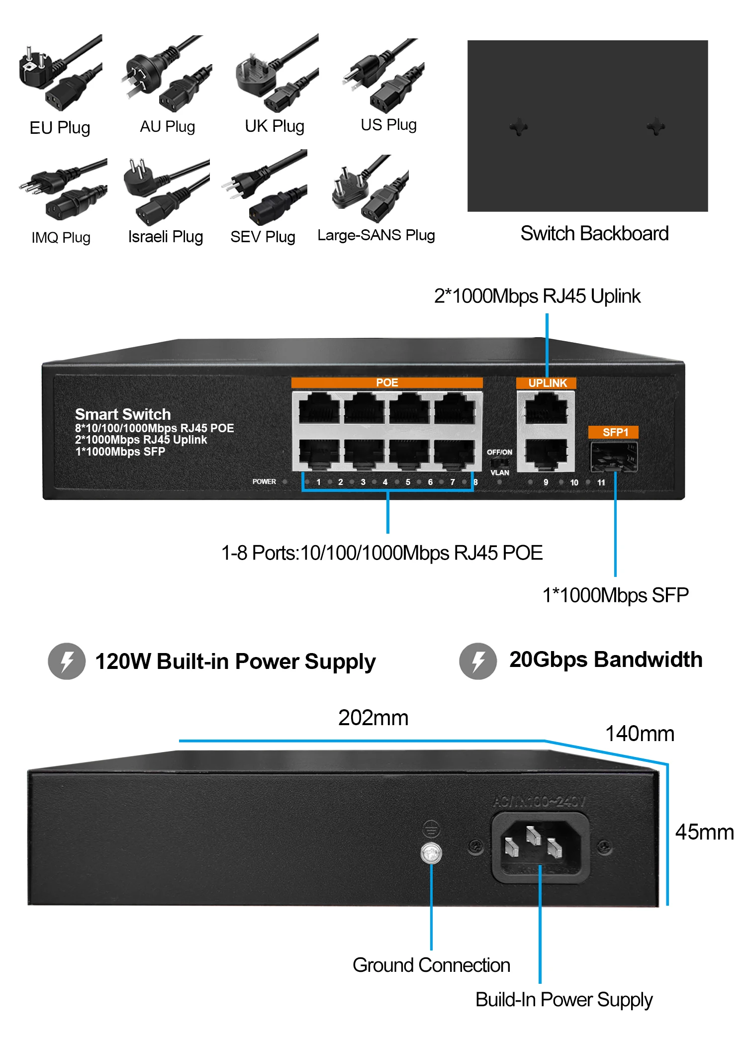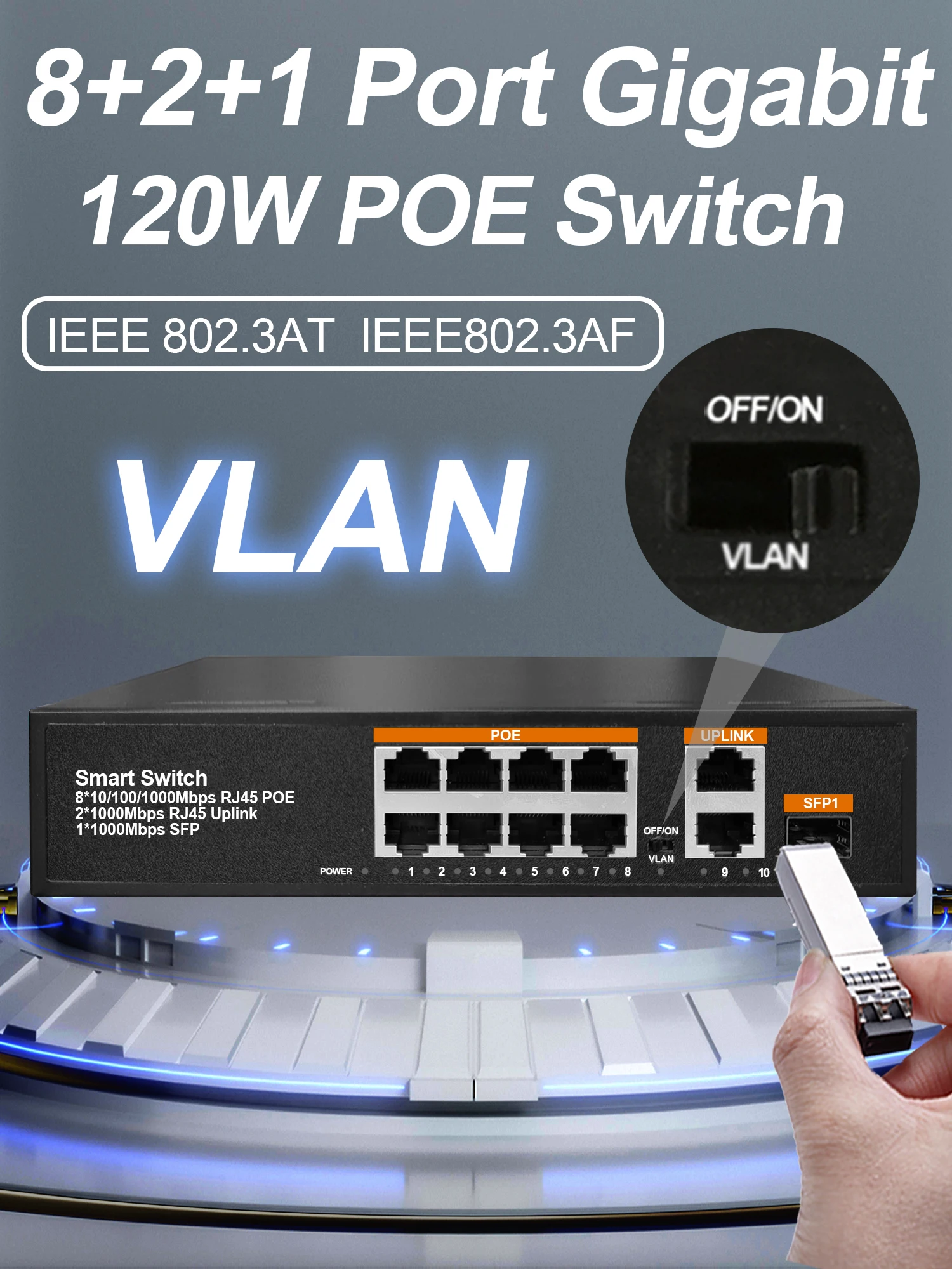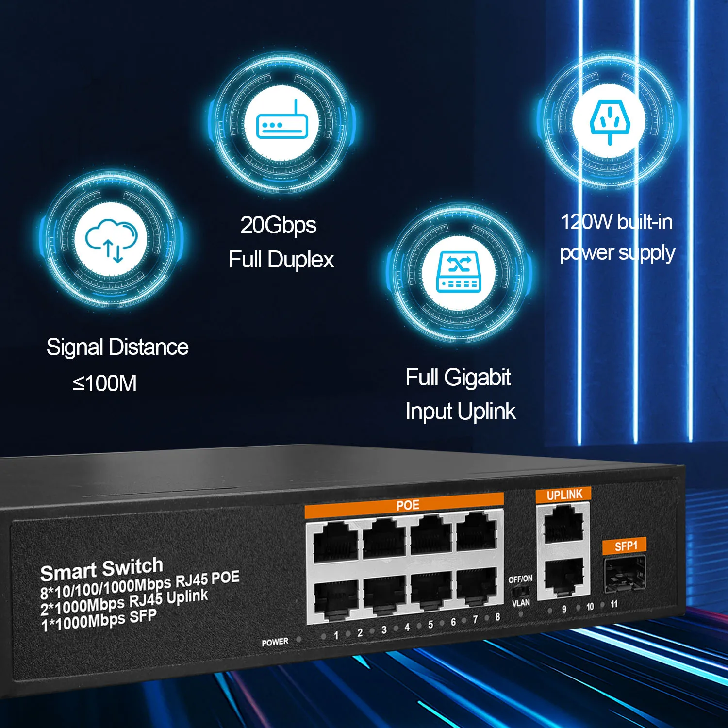Comprar Conmutador POE Gigabit completo, conmutador de red Ethernet de 11 puertos no administrado, 8 POE + 2 RJ45 + 1 puertos de enlace ascendente SFP, 120W, VLAN, IEEE 802.3af/at