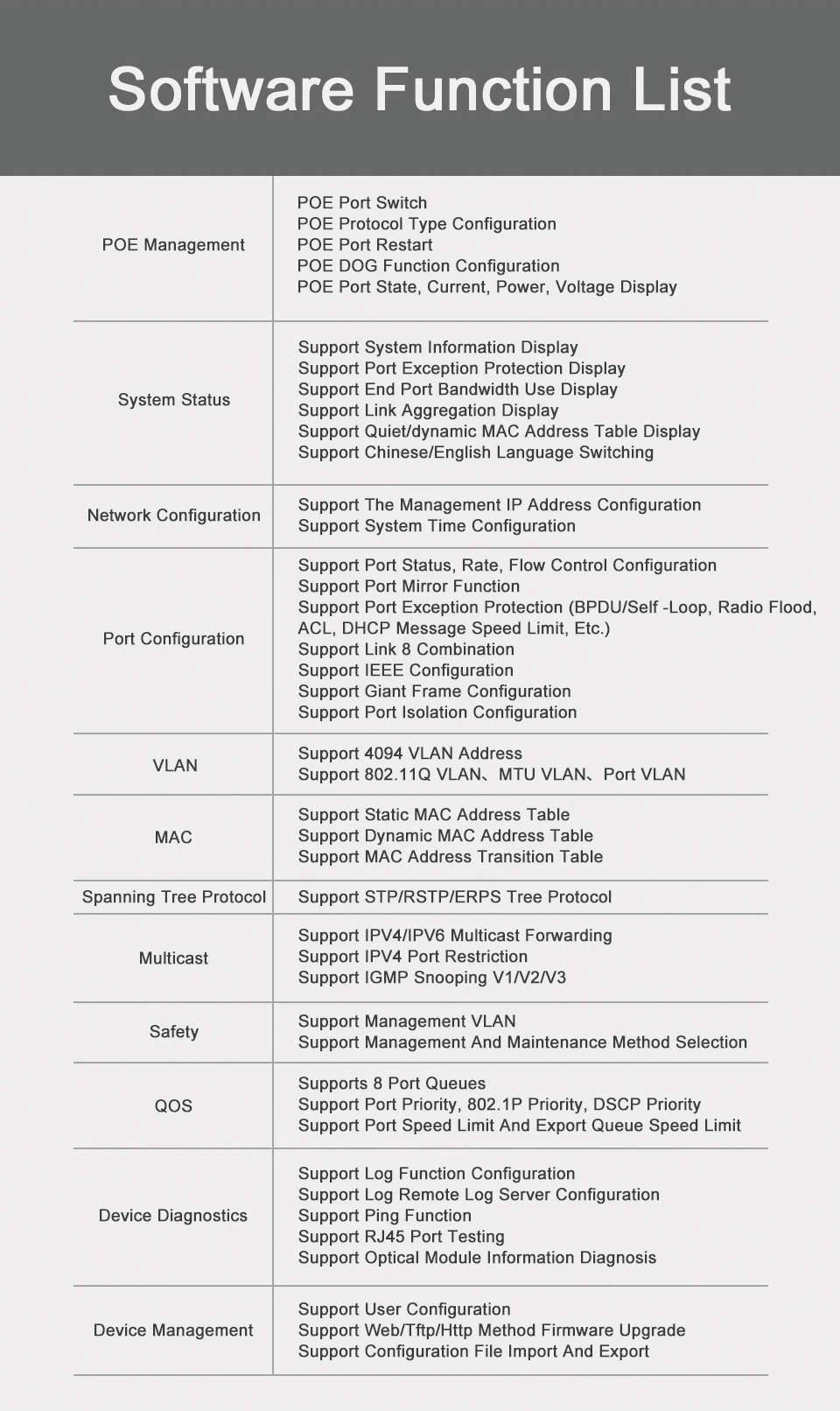 ◆ Admite monitoreo de puertos copiando una copia del paquete de datos desde el puerto monitoreado al puerto de monitoreo para lograr monitoreo de red.