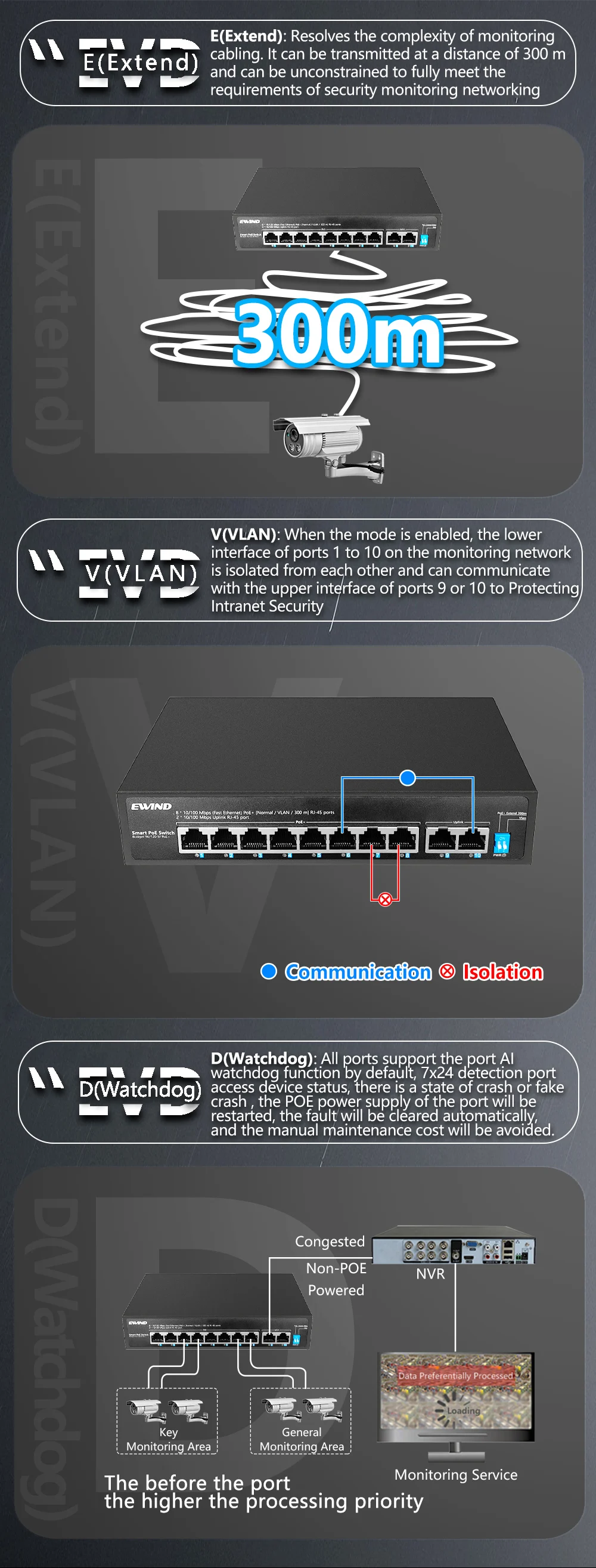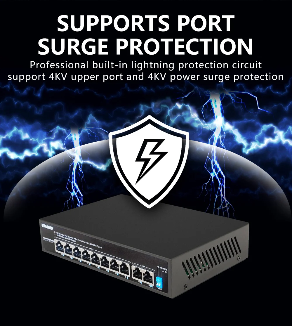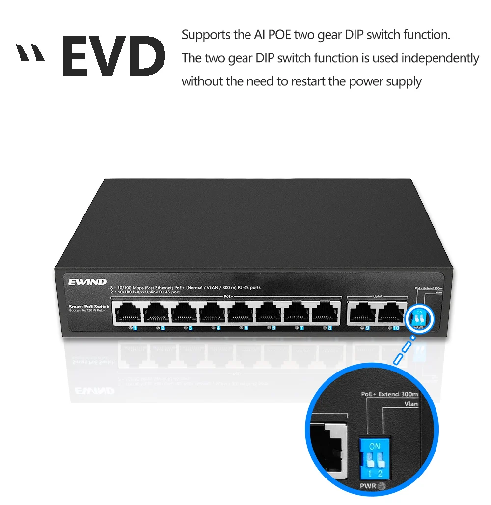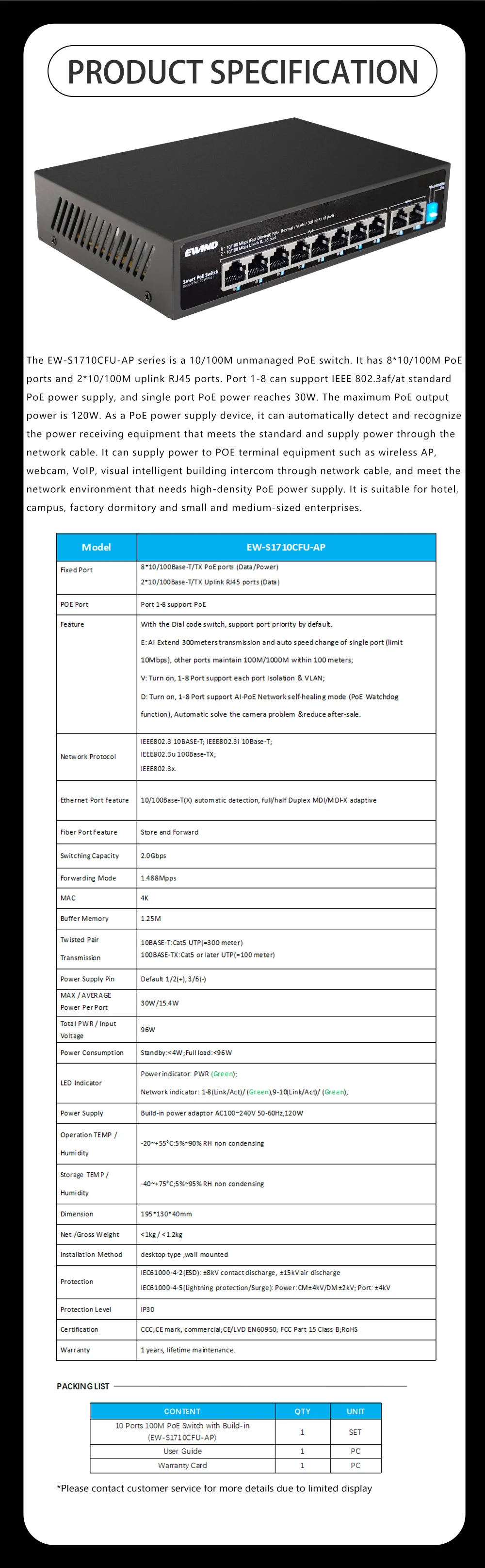 La serie EW-S1710CFU-AP es un conmutador PoE no administrado de 10/100 M.Tiene puertos PoE de 8*10/100M y 2*10/100M