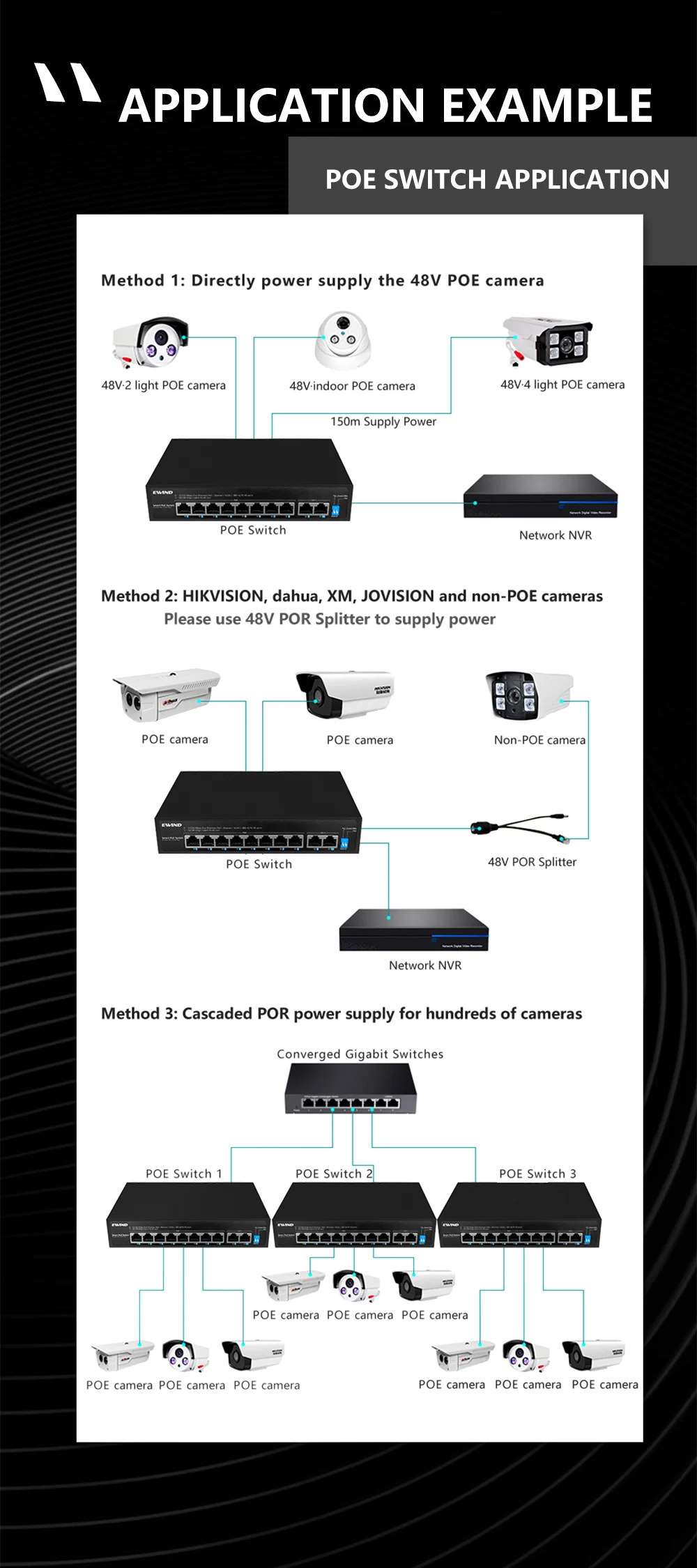 y reconozca el equipo receptor de energía que cumpla con el estándar y suministre energía a través del cable de red.Puede suministrar energía a equipos terminales POE como AP inalámbricos, cámaras web, VoIP y edificios visuales inteligentes.