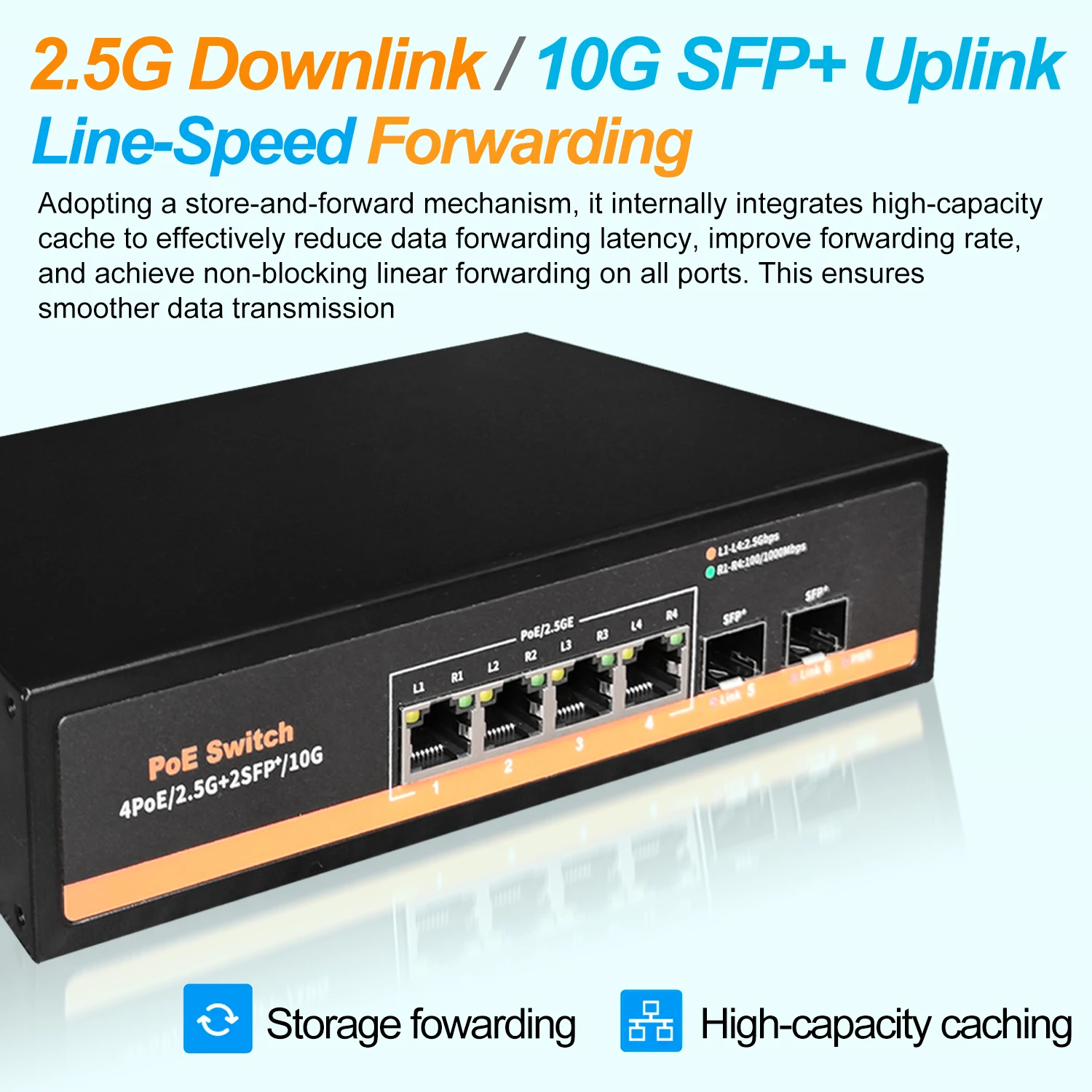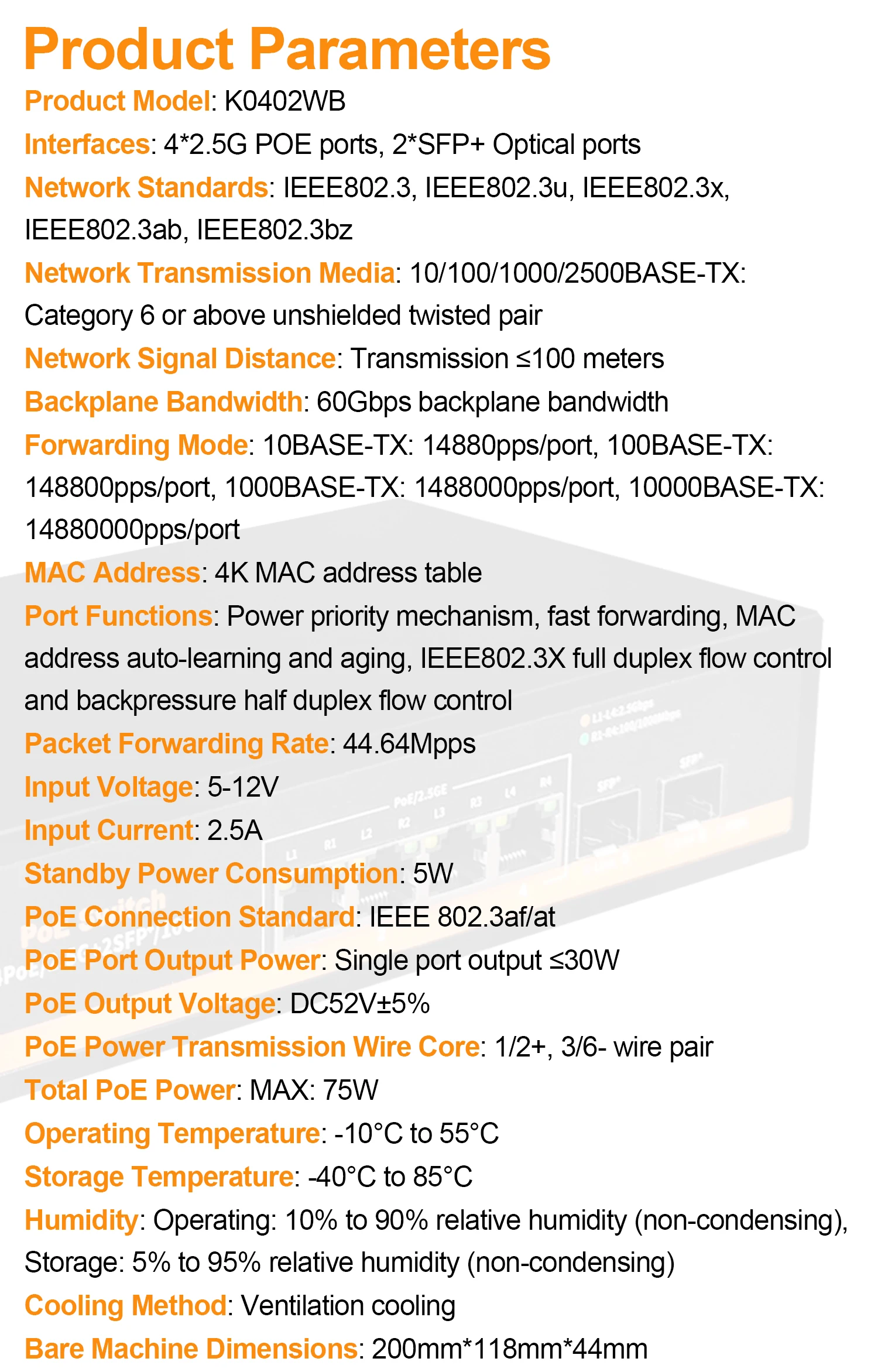 El conmutador Ethernet POE K0402WB es un conmutador que proporciona 4 puertos PoE de 2,5G y 2 puertos ópticos SFP + de 10G. Cumple con los estándares 802. 3AF/AT con una potencia máxima de 75W. Permite la transmisión directa de alta velocidad de varios dispositivos 2,5G, utilizando un mecanismo de almacenamiento y reenvío con caché de alta capacidad integrado para reducir eficazmente la latencia de reenvío de datos. Todos los puertos admiten reenvío de velocidad de línea sin bloqueo.