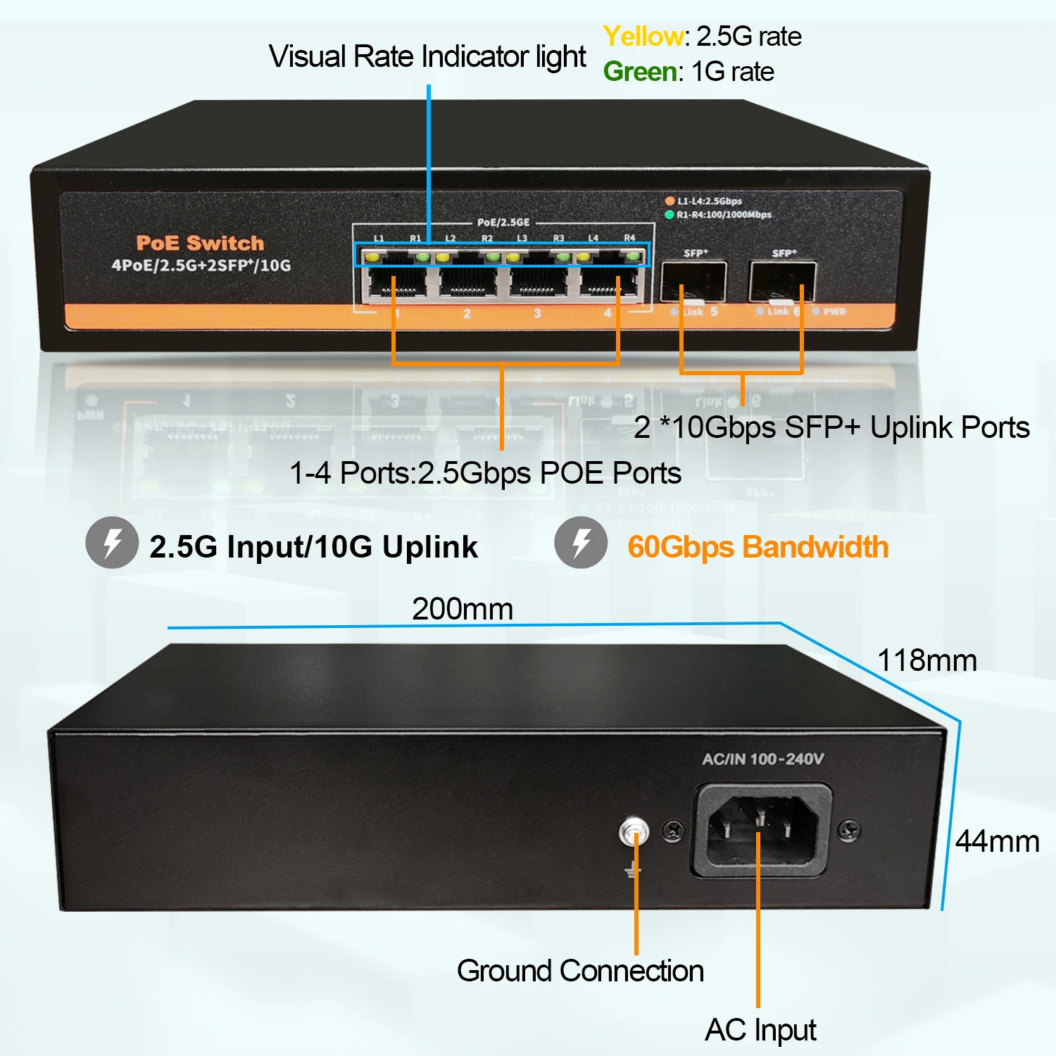 Comprar Conmutador de red Ethernet sin ventilador, Hub LAN no gestionado de 2.5G POE/POE + 75W, 4x2,5G + 2x10G SFP + puertos de enlace ascendente para AP VDI inalámbrico